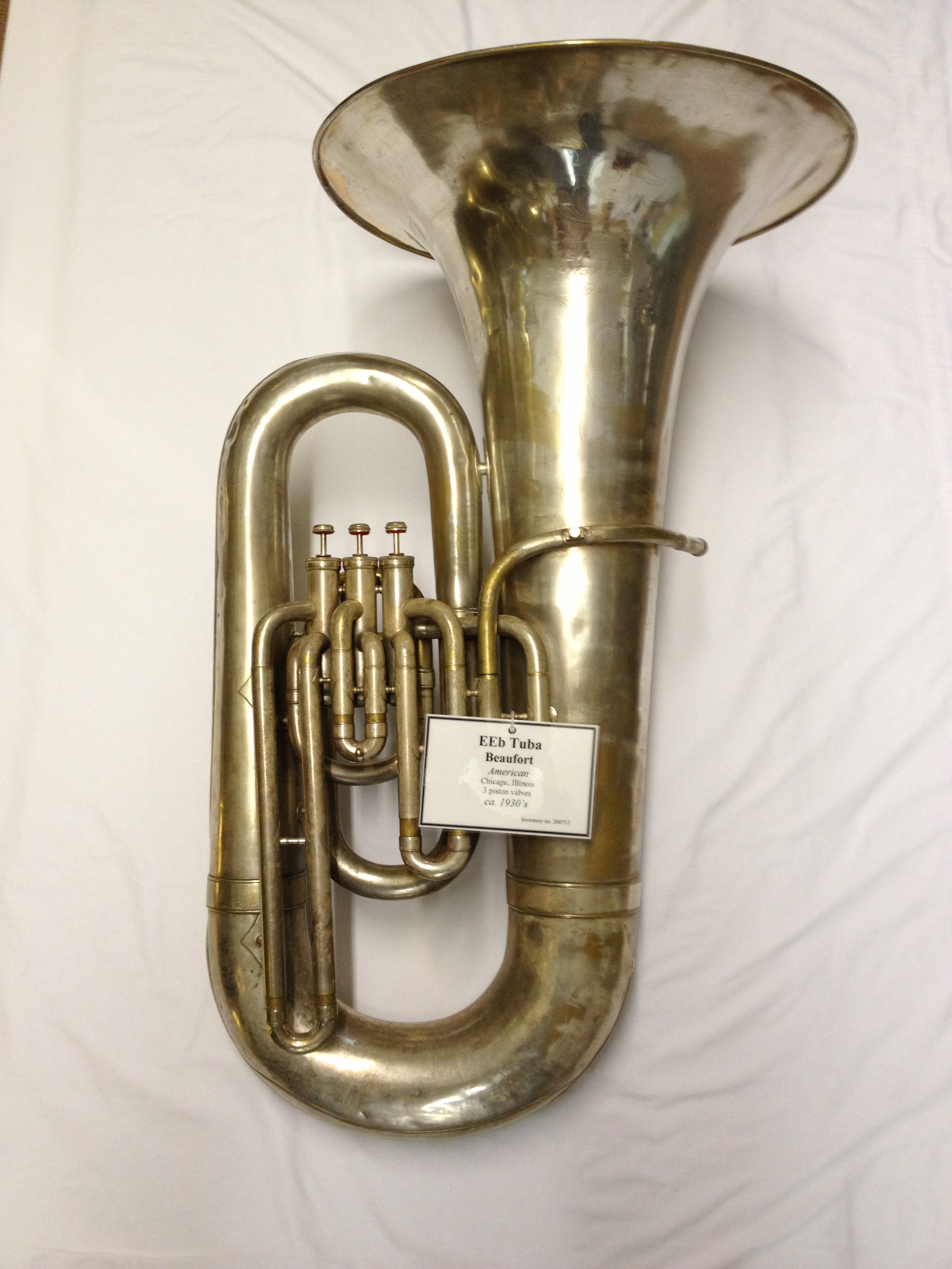Beaufort, American, EE flat tuba, 3 piston, c.1930 Tag #: 200713 Serial #: Bell Diameter Bore Size Height 20.0″ .693″ 36.0″ Comments: “BEAUFORT / AMERICAN / CHICAGO / USA” on bell. Floral engraving around identification marks. This instrument was genorously donated by Mr. and Mrs. Richard H. Dunlap. Share this: Click to share on X (Opens in new window) X Click to share on Facebook (Opens in new window) Facebook Like Loading...