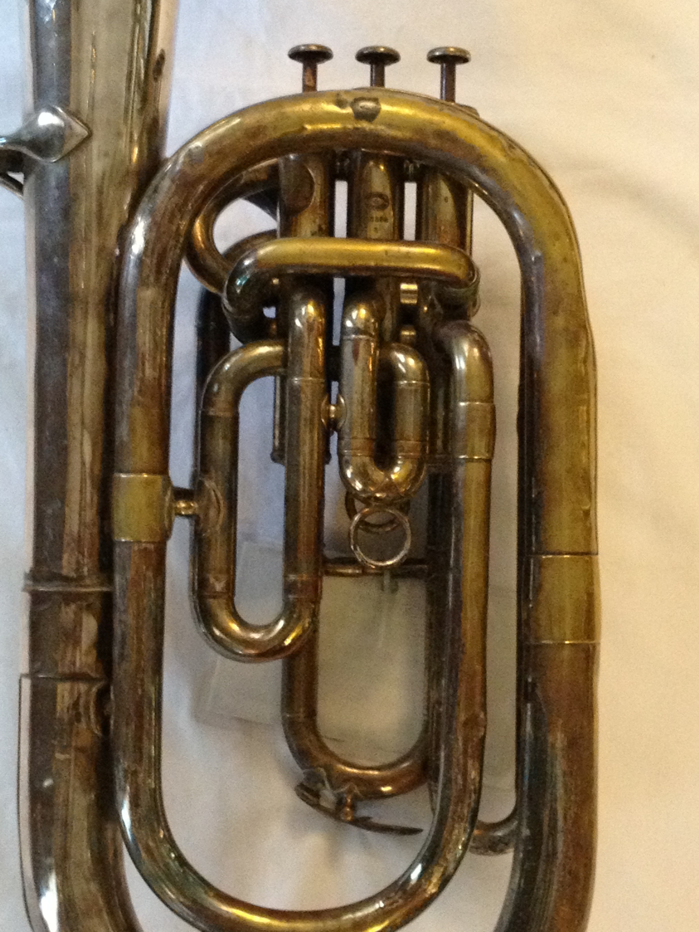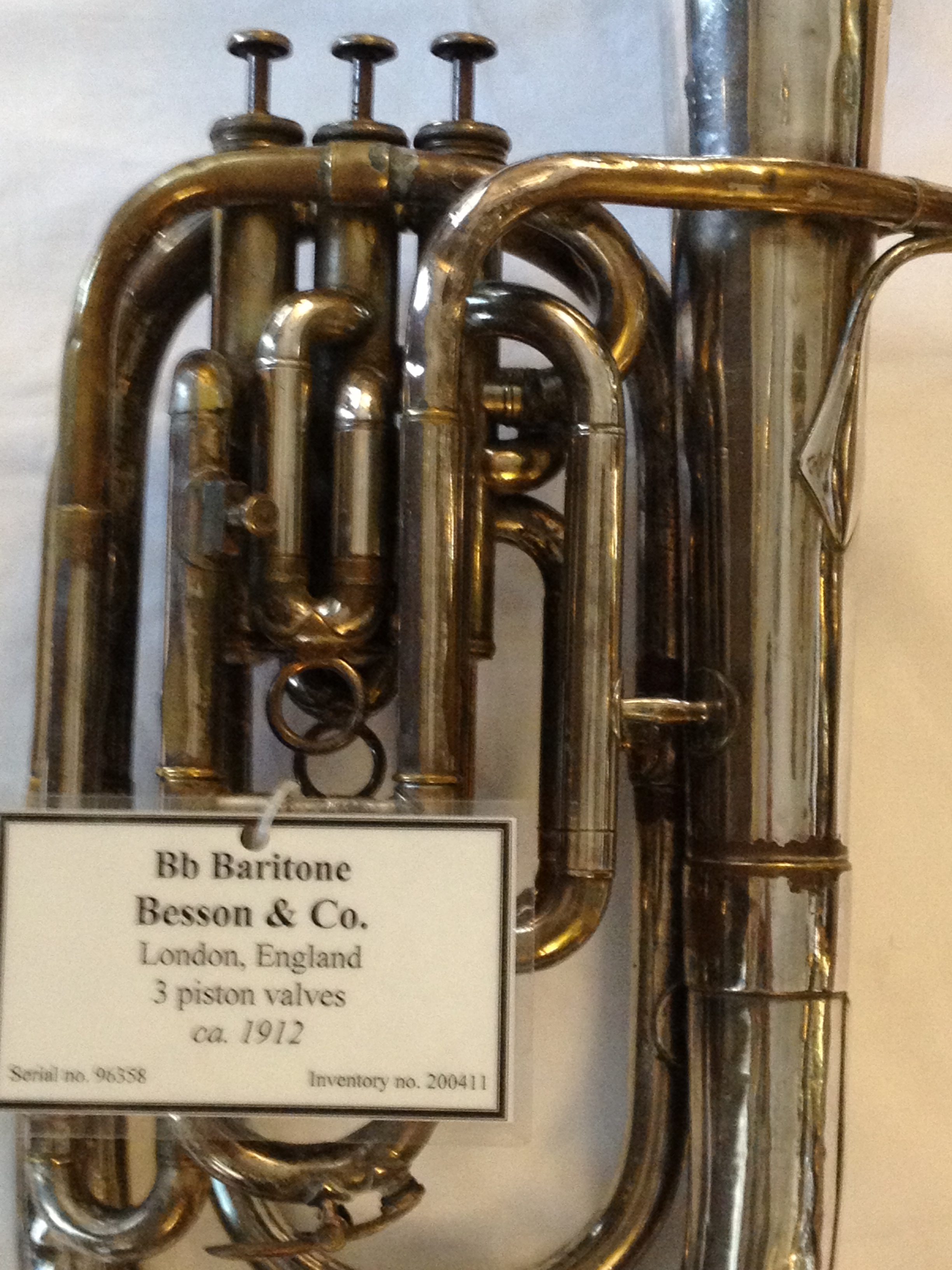 “CLASS / A / Enharmonic / Patented / 50 Medals of Honor / B / Besson & Co. / “PROTOTYPE” / 198 EUSTON ROAD / LONDON / ENGLAND / * / A.P. SYKES / MELBOURNE” on bell. Very beautiful ornate floral design on bell around indentification marks. “BESSON & CO. / * / BREVETE” on 2nd valve.