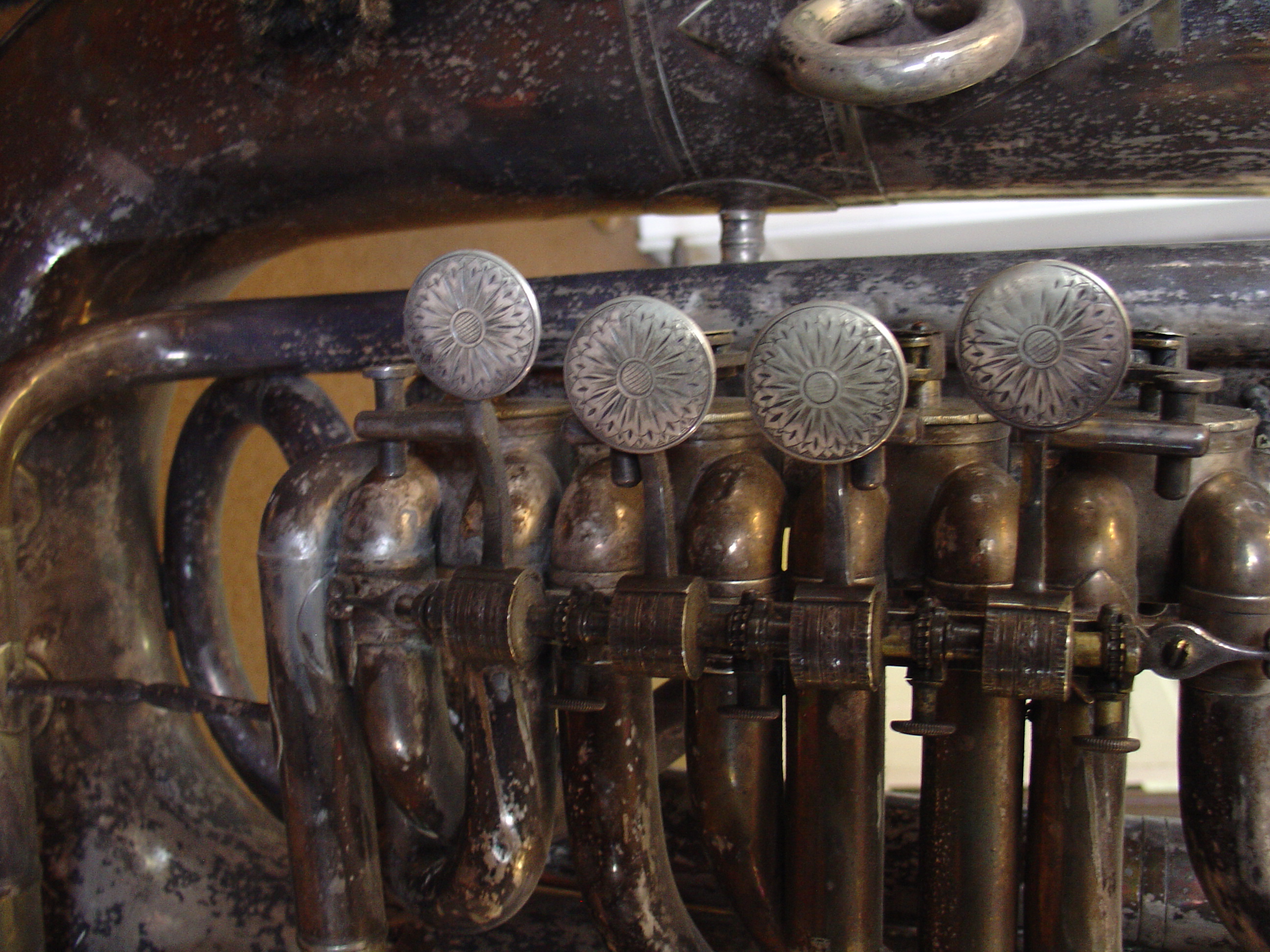 This tuba features an 1873 patented feature of Cerveny instruments, their Walzenventile, or “roller valves”. This roller valve mechanism is basically rotary valves that have been rotated 90 degrees from their typical position. This was done to simplify the mechanism, by increasing the mechanical advantage of the lever system. The 1873 patent also covered the spring tension adjusting screws, seen in this example as well. This mechanism was an extra cost option on their higher grades of instruments.