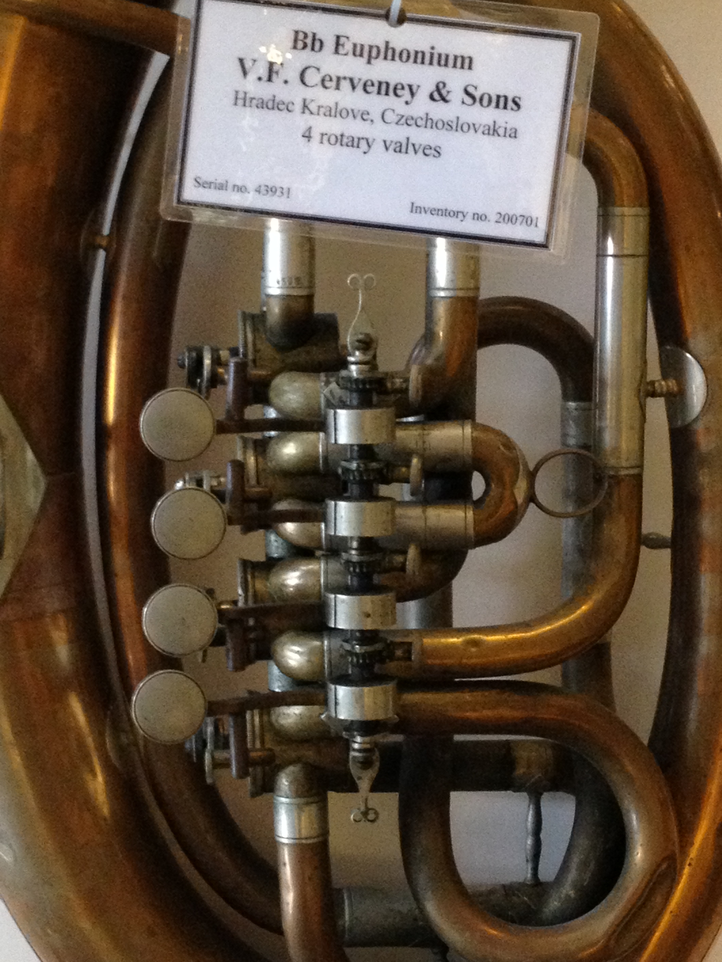 This Cerveny roller-valved horn exhibits the much less ornate seal used in the home market. Contrast this with the ornate seal applied by the Chicago distributor, and shown on the BBb tuba #09314 in the special collection. Additionally, this was not the highest grade of decoration, as compared to the beautifully engraved valve mechanism of the BBb tuba #09314.