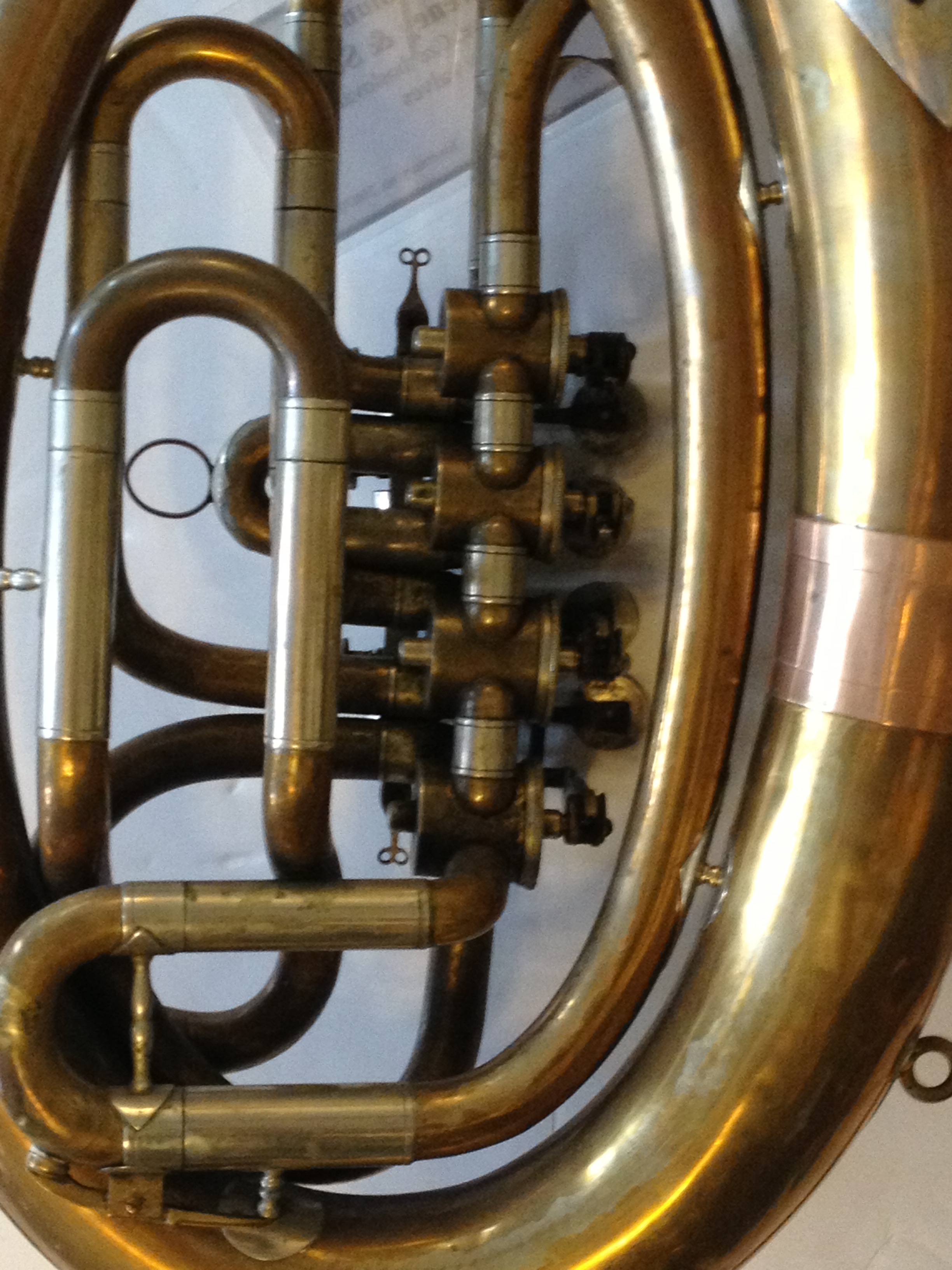 This euphonium also features the 1873 patented feature of Cerveny instruments, their Walzenventile, or “roller valves”. This roller valve mechanism is basically rotary valves that have been rotated 90 degrees from their typical position. This was done to simplify the mechanism, by increasing the mechanical advantage of the lever system. The 1873 patent also covered the spring tension adjusting screws, seen in this example as well. This mechanism was an extra cost option on their higher grades of instruments.