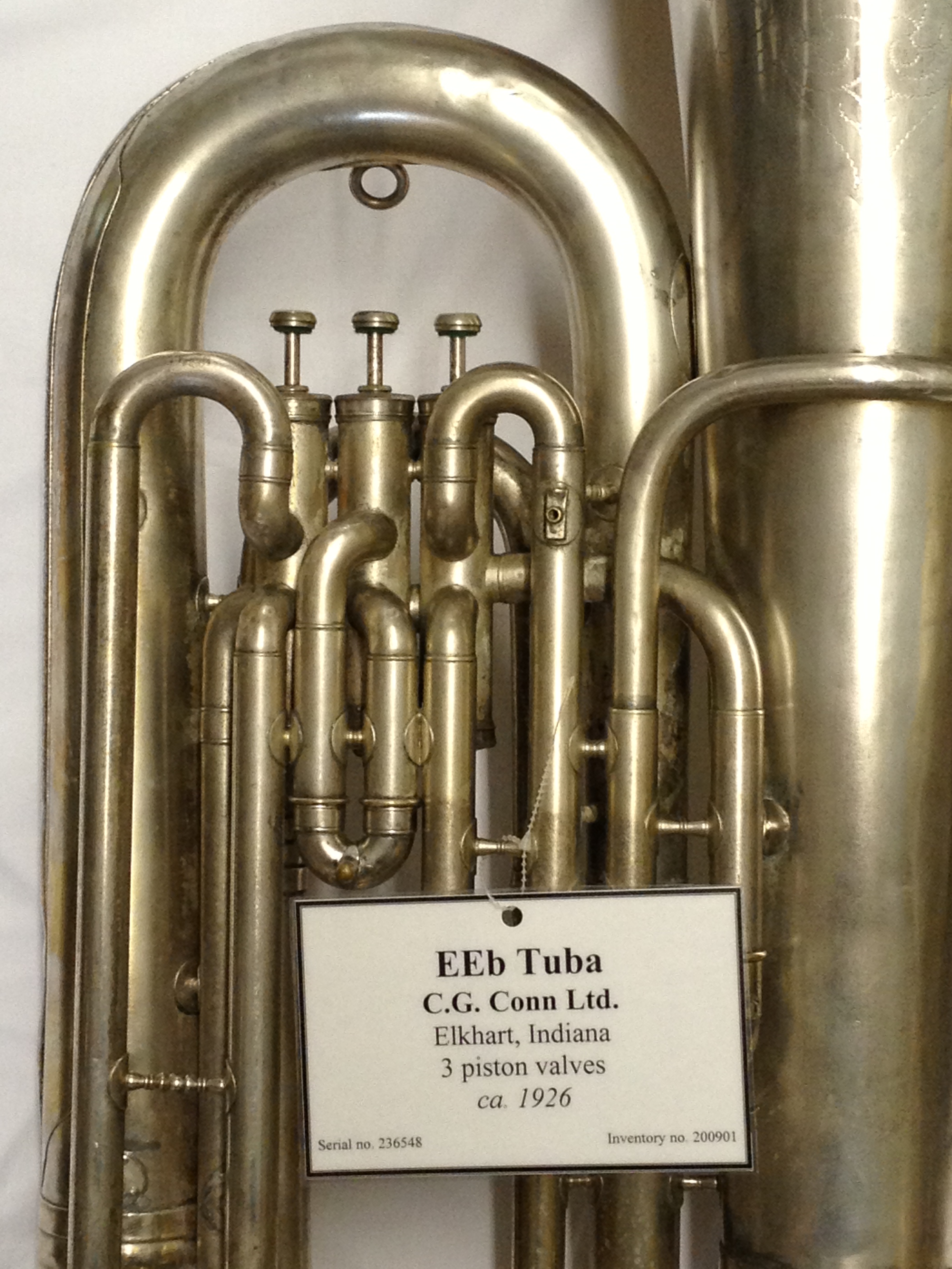 Conn, Standard 2J, E flat tuba, 3 piston, 1926 Tag #: 200901 Serial #: 236548 Bell Diameter Bore Size Height 16.0″ .625″ 31.5″ Comments: “MADE BY / C.G. Conn Ltd. / ELKHART, IND. / U.S.A.” on bell. Share this: Click to share on X (Opens in new window) X Click to share on Facebook (Opens in new window) Facebook Like Loading...
