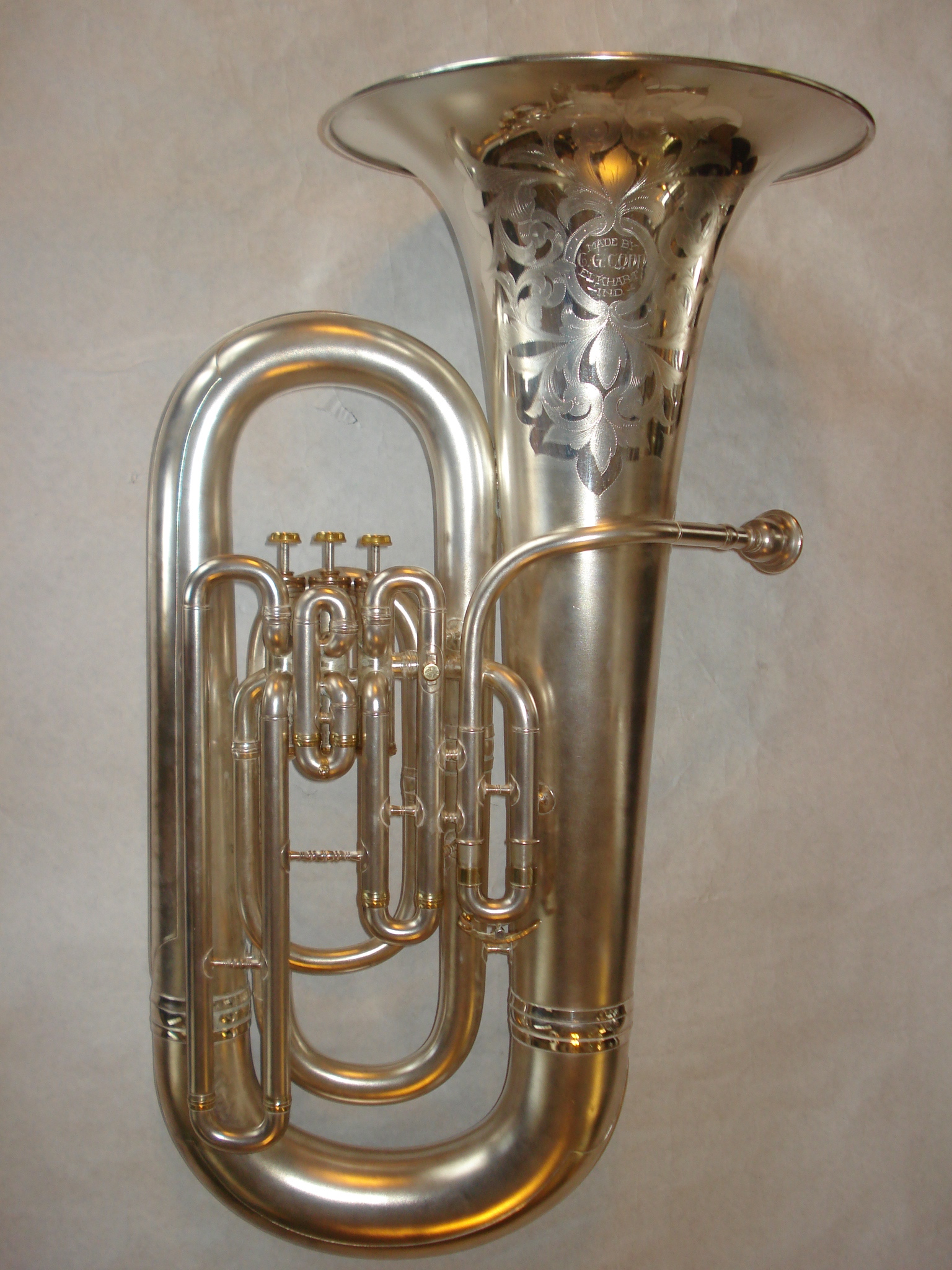 It is interesting to contrast the engraving of this horn with that of the larger EEb Giant model in the feature collection. The larger instrument was finished to #3 specification, which entails no gold plating, and a simpler bell engraving.