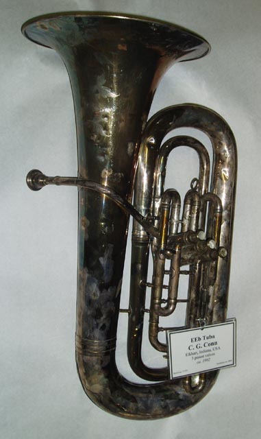 Conn, American, E flat tuba, 3 piston, 1901 Tag #: 00004 Serial #: 71777 Bell Diameter Bore Size Height 14 1/8″ .620″ 31.0″ Comments: “MADE BY / C.G. CONN / Elkhart / Ind.” on bell. “E-Bass” stamped on mouthpiece. Share this: Click to share on X (Opens in new window) X Click to share on Facebook (Opens in new window) Facebook Like Loading...