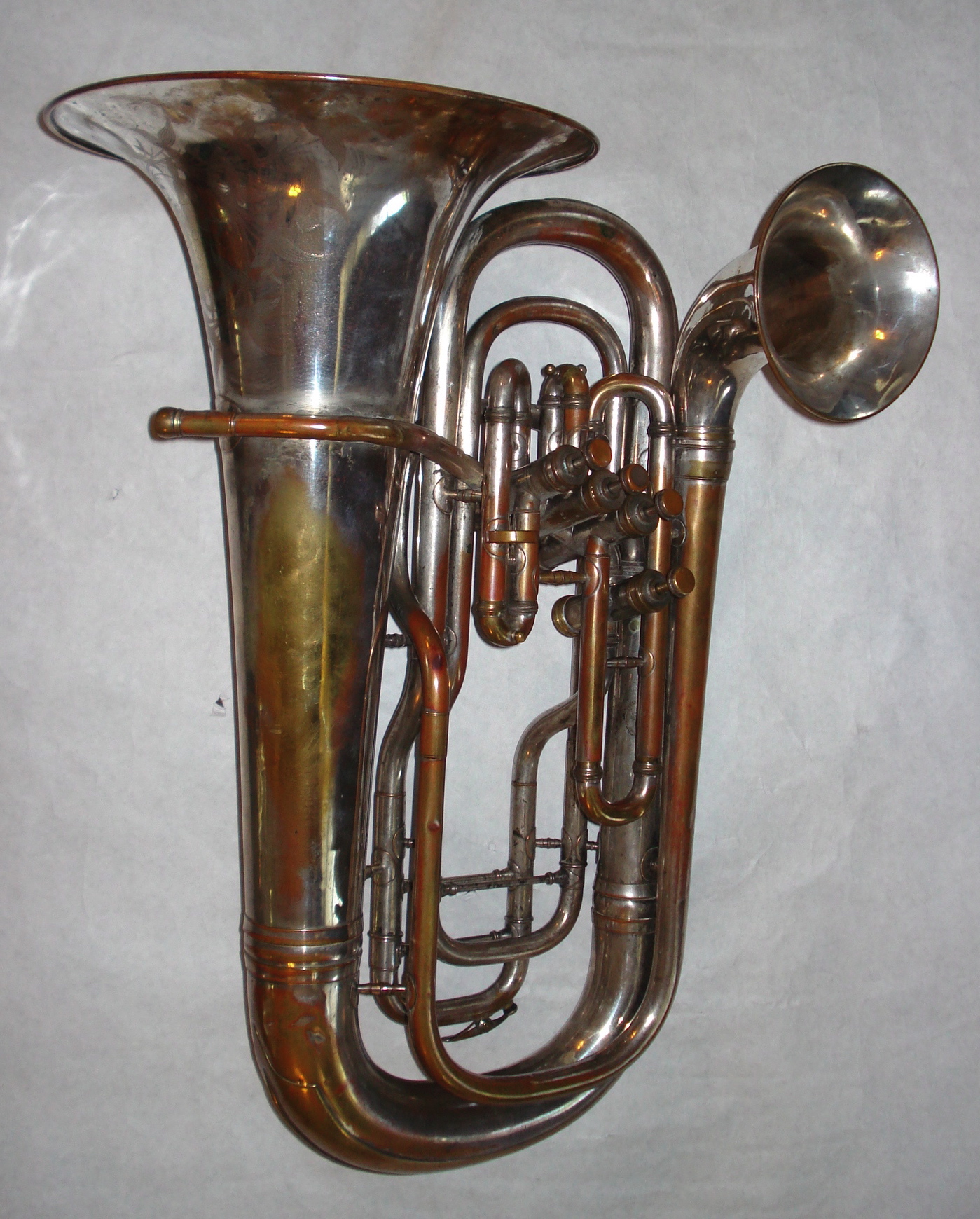 “MADE BY / C.G. CONN / ELKHART, IND. / -&- / WORCESTER / MASS.” on bell, withim ornate floral engraving. “1”, “2 / 23156”, “3” stamped on first, second, and third valves, respectively. “338” stamped on second bell valve.