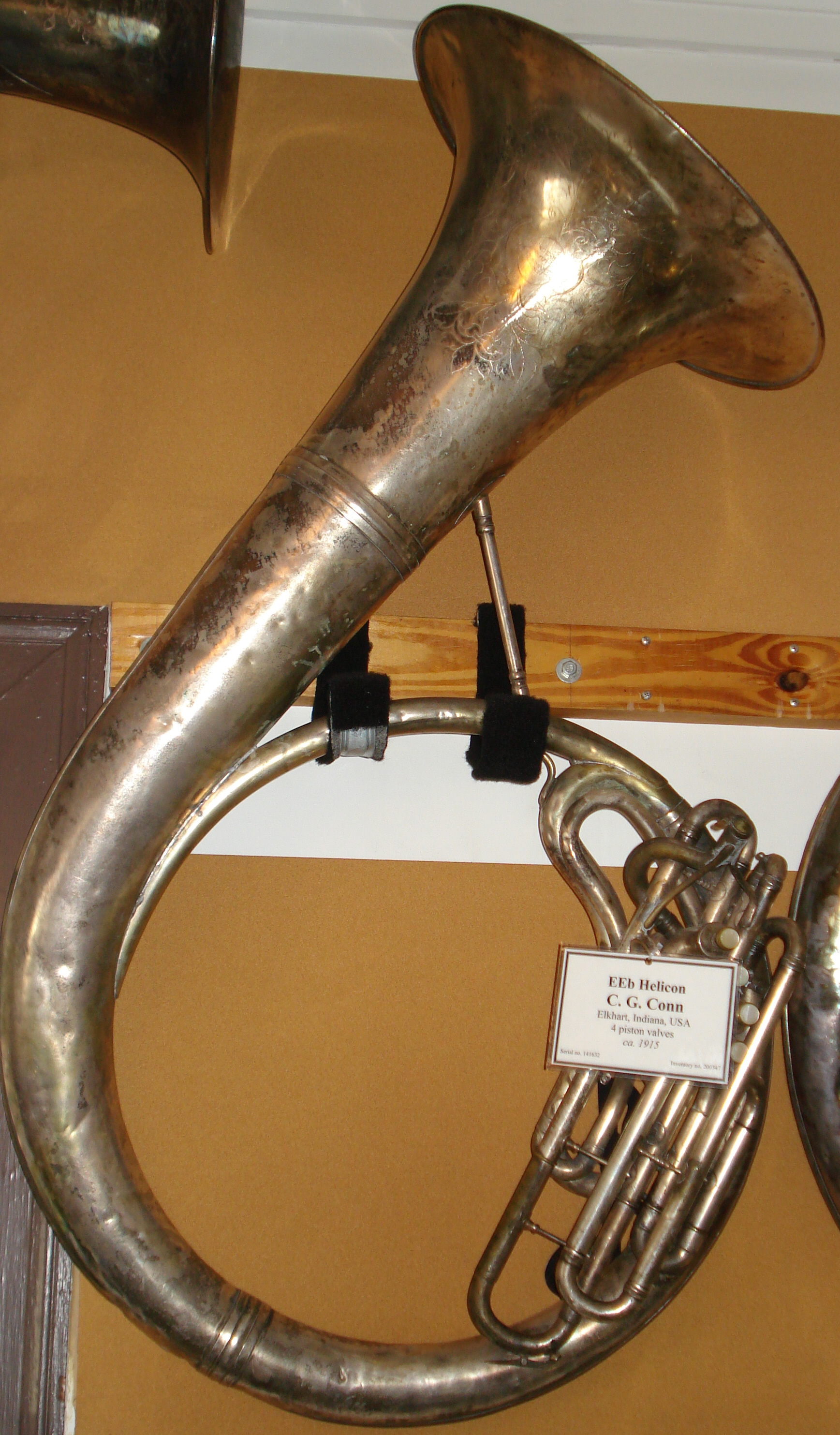 Conn, New Wonder, EE flat helicon, 4 piston, 1913 Tag #: 200347 Serial #: 141632 Bell Diameter Bore Size Valve 19 1/4″ .692″ 4 Piston Comments: “MADE BY / C.G. CONN Ltd. / ELKHART / IND.” on bell. Floral engraving around identification marks. Share this: Click to share on X (Opens in new window) X Click to share on Facebook (Opens in new window) Facebook Like Loading...