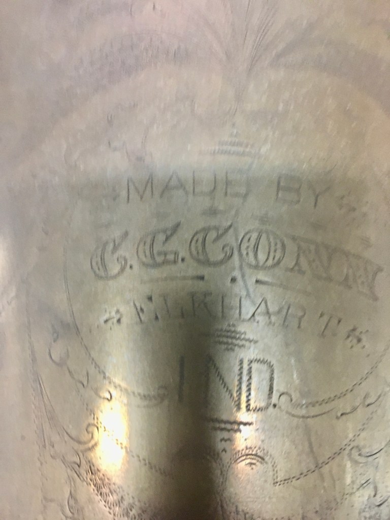 “Made By/ CG Conn/ Elkhart/ IND” on bell.