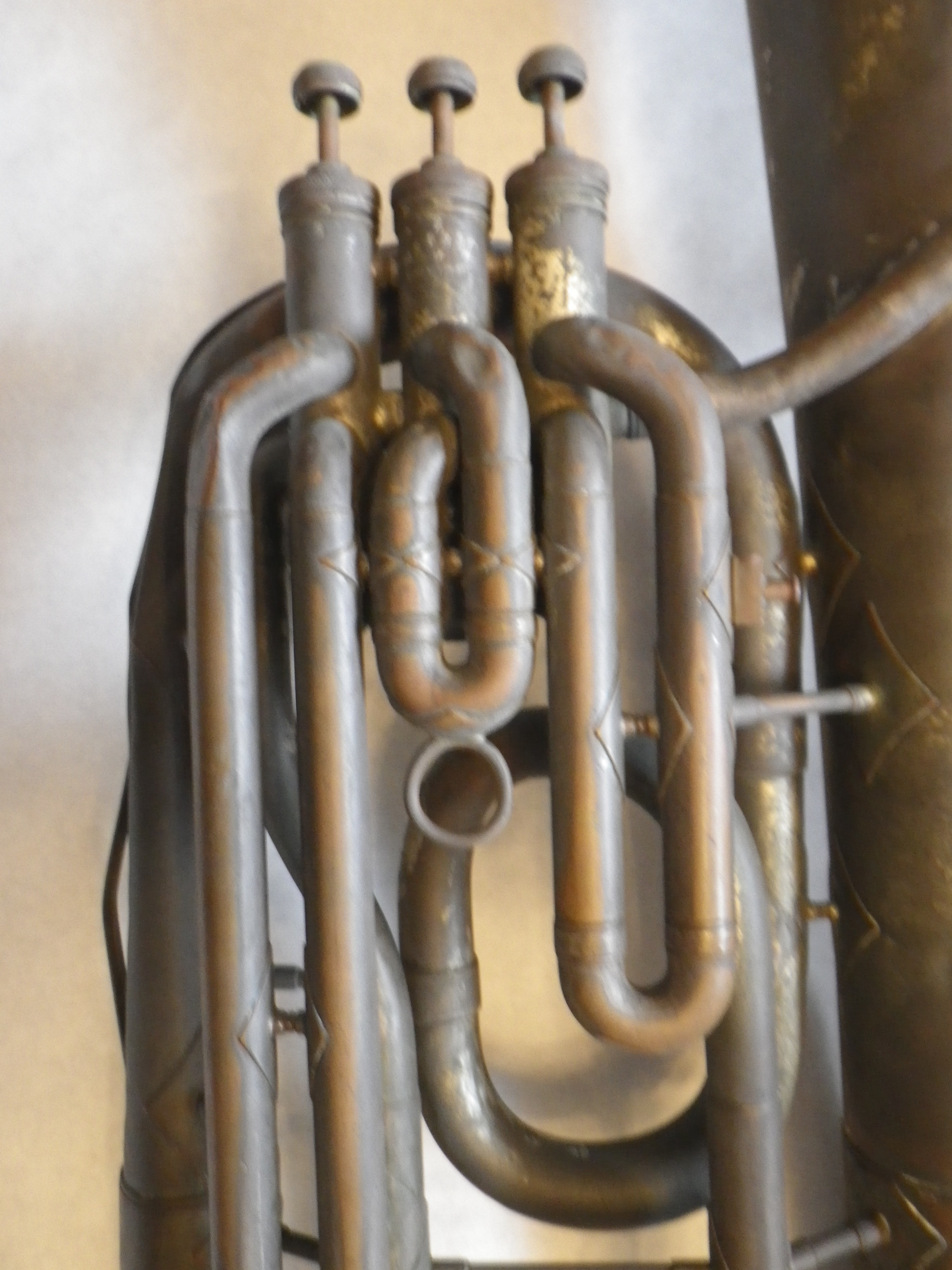 THE / Buescher / ELKHART / IND. Inside scroll engraving on bell. Pat oct 23, 07 and true tone triangle on second valve. 1 2 3 on valves. LP and SN on second valve.
