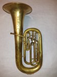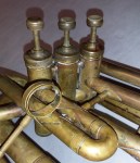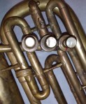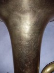 Comments: “THE/BUESCHER/ELKHART” engraved on bell surrounded by ornate design around text. The patent number is below “BUESCHER”, which dates “OCT. 29. 07”. The serial number is on the lower half of the second valve.