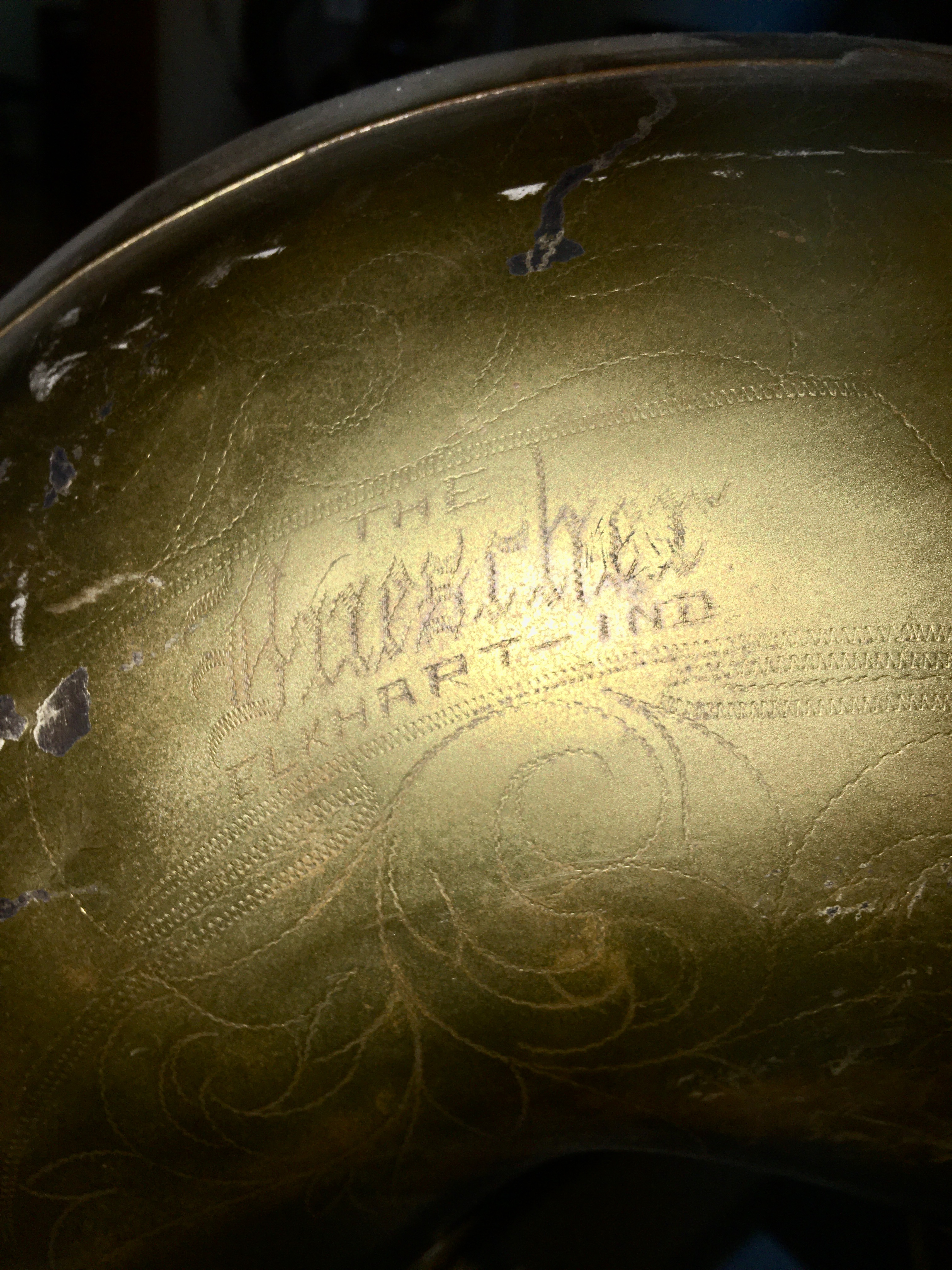 “THE / BUESCHER / ELKHART – IND.” on bell. Some floral engraving around identification marks.