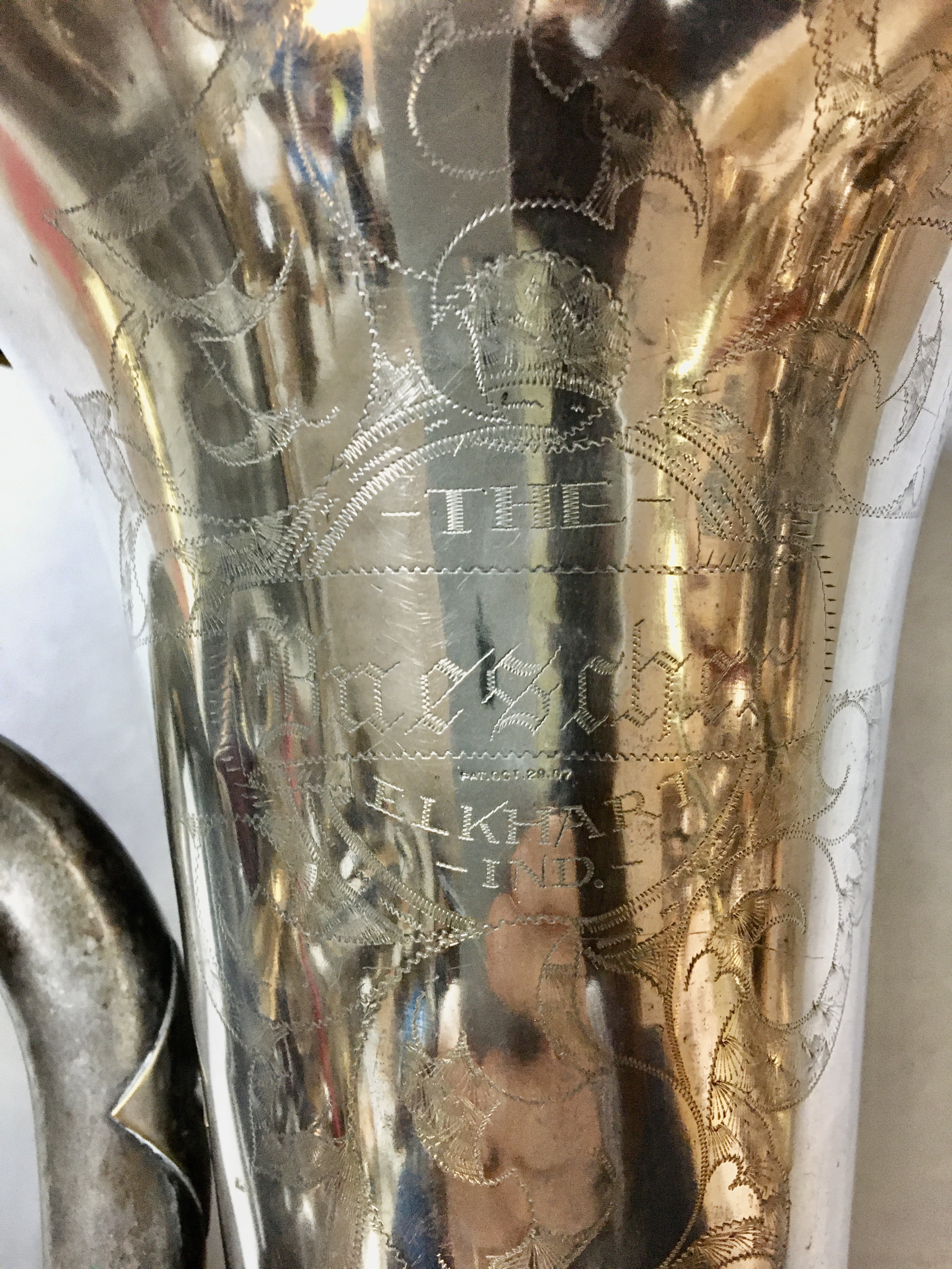 “THE BUESCHER / ELKHART / IND.” on bell. Floral engraving around identification marks.