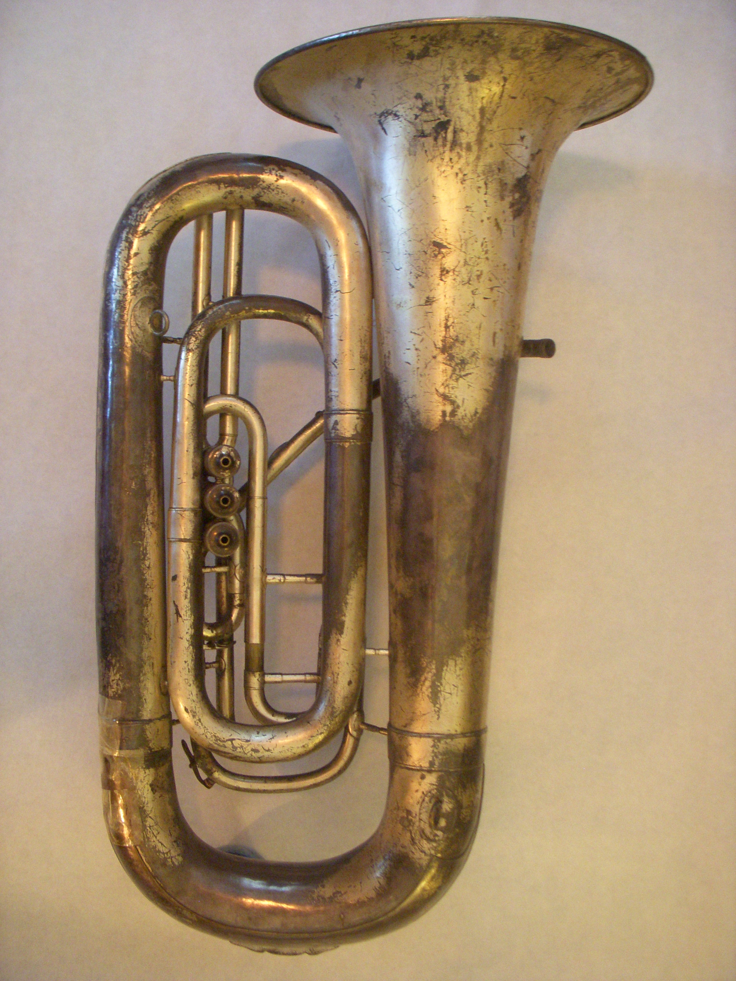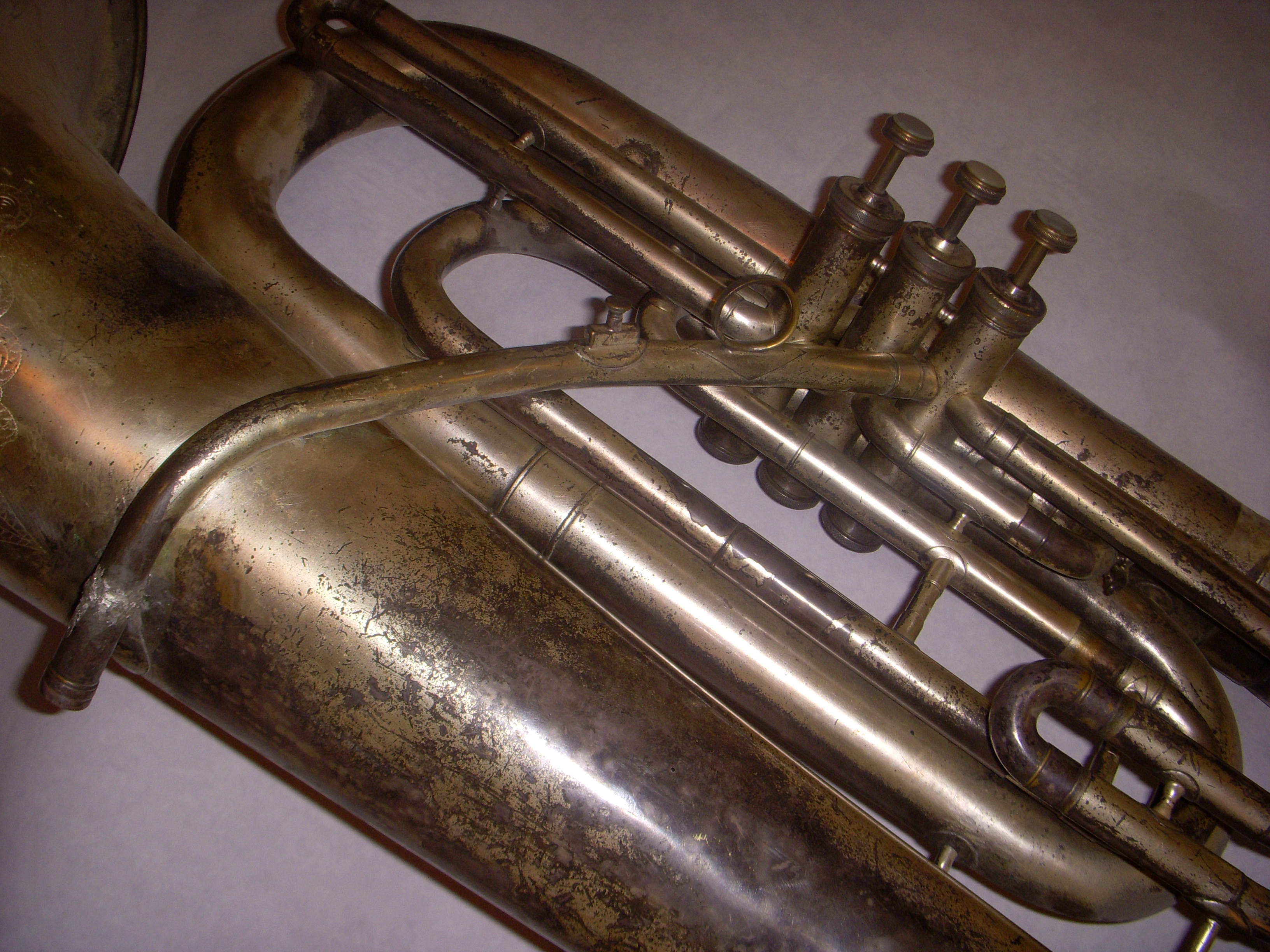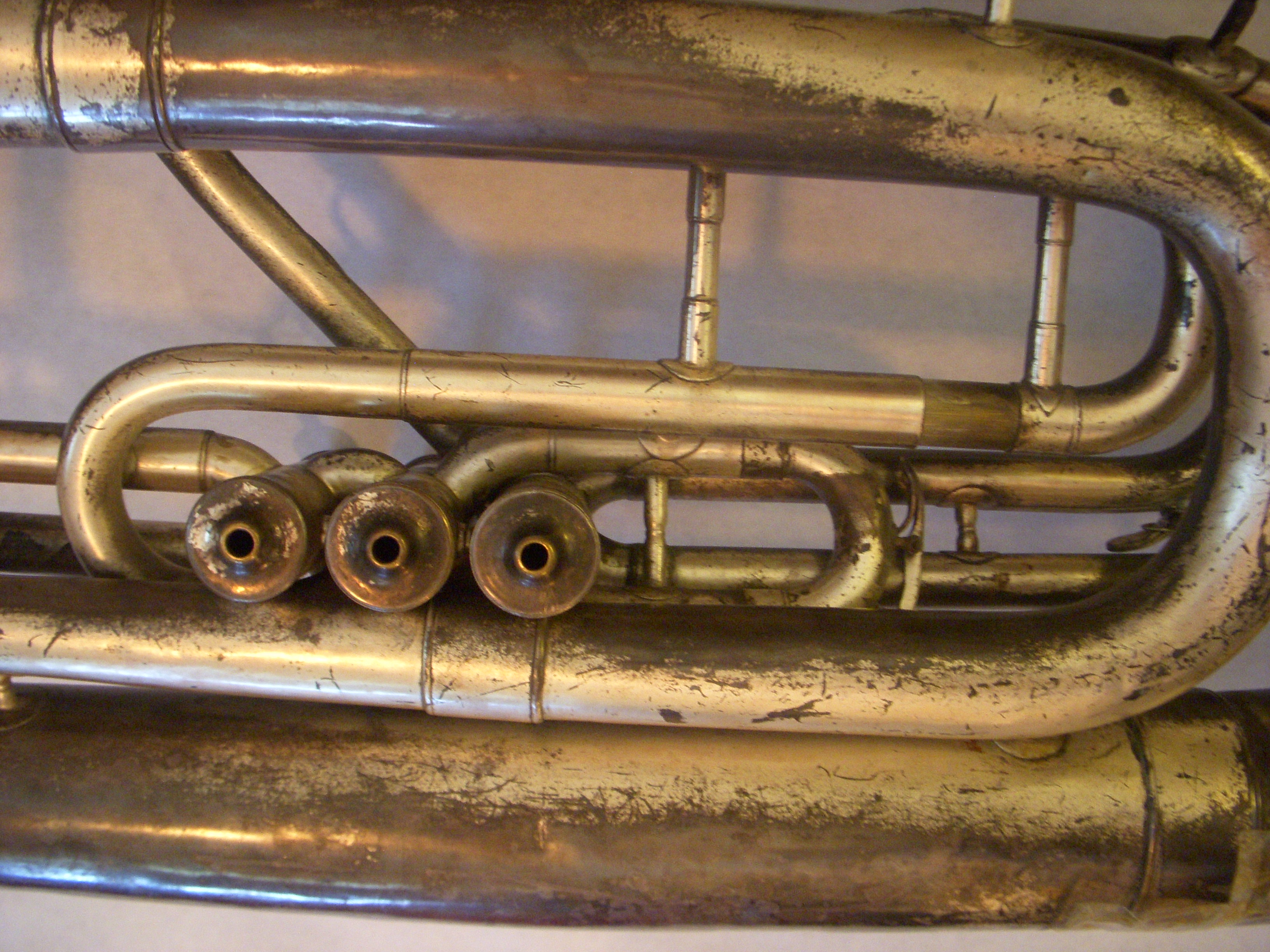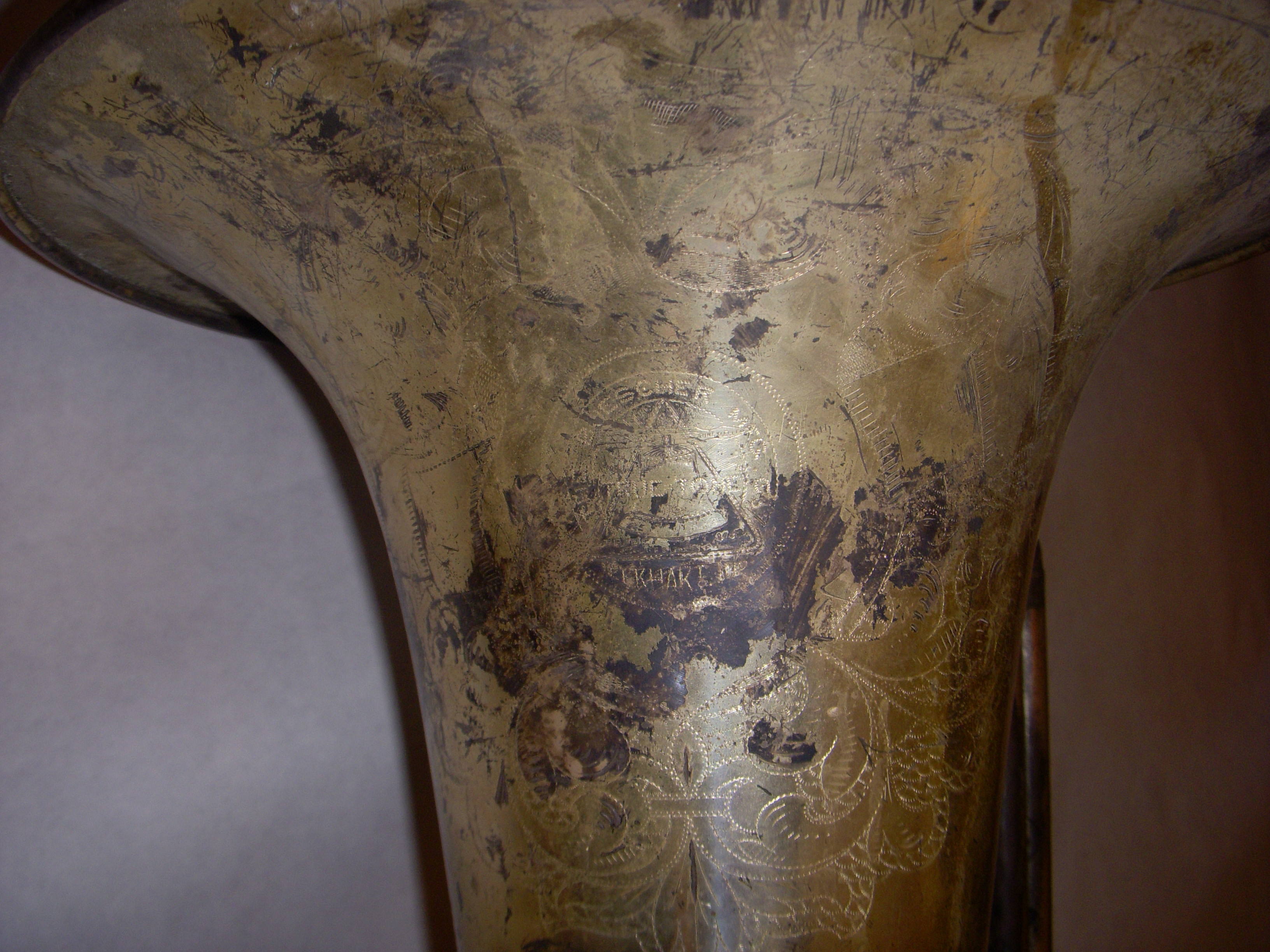 “The Buescher Mfg. Co” around outside of seal/” True-Tone”/ “Trade Mark”/” registered”/” Elkhart, Ind”. Engraved picture of a hanging bell part of seal. Beautiful relief engraving on bell around seal. 1,2,3 on valves. SN on second valve.