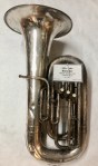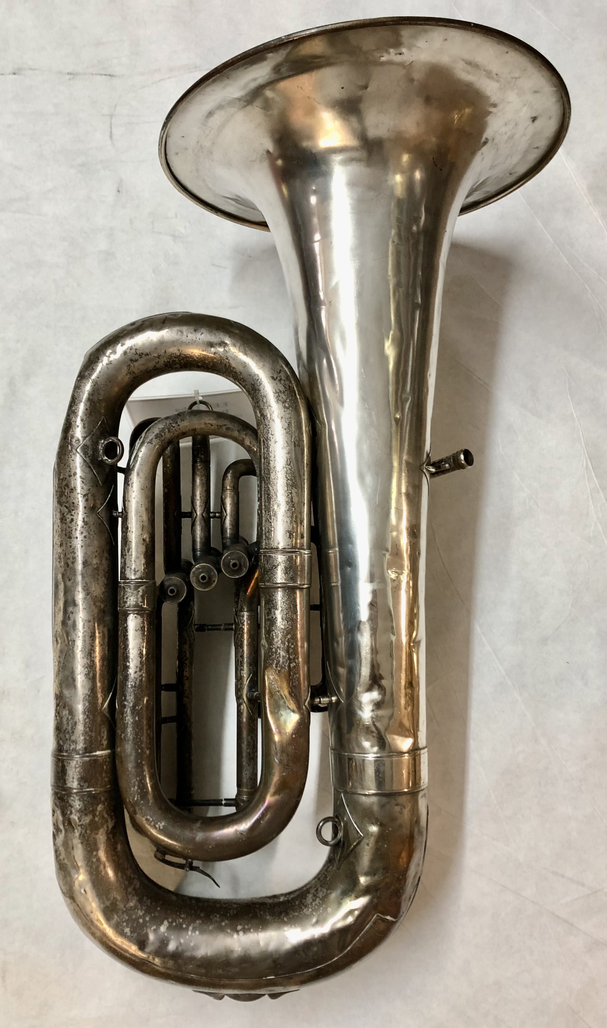 “THE / BUESCHER / ELKHART / IND.” on bell. Floral engraving around identification marks.