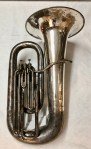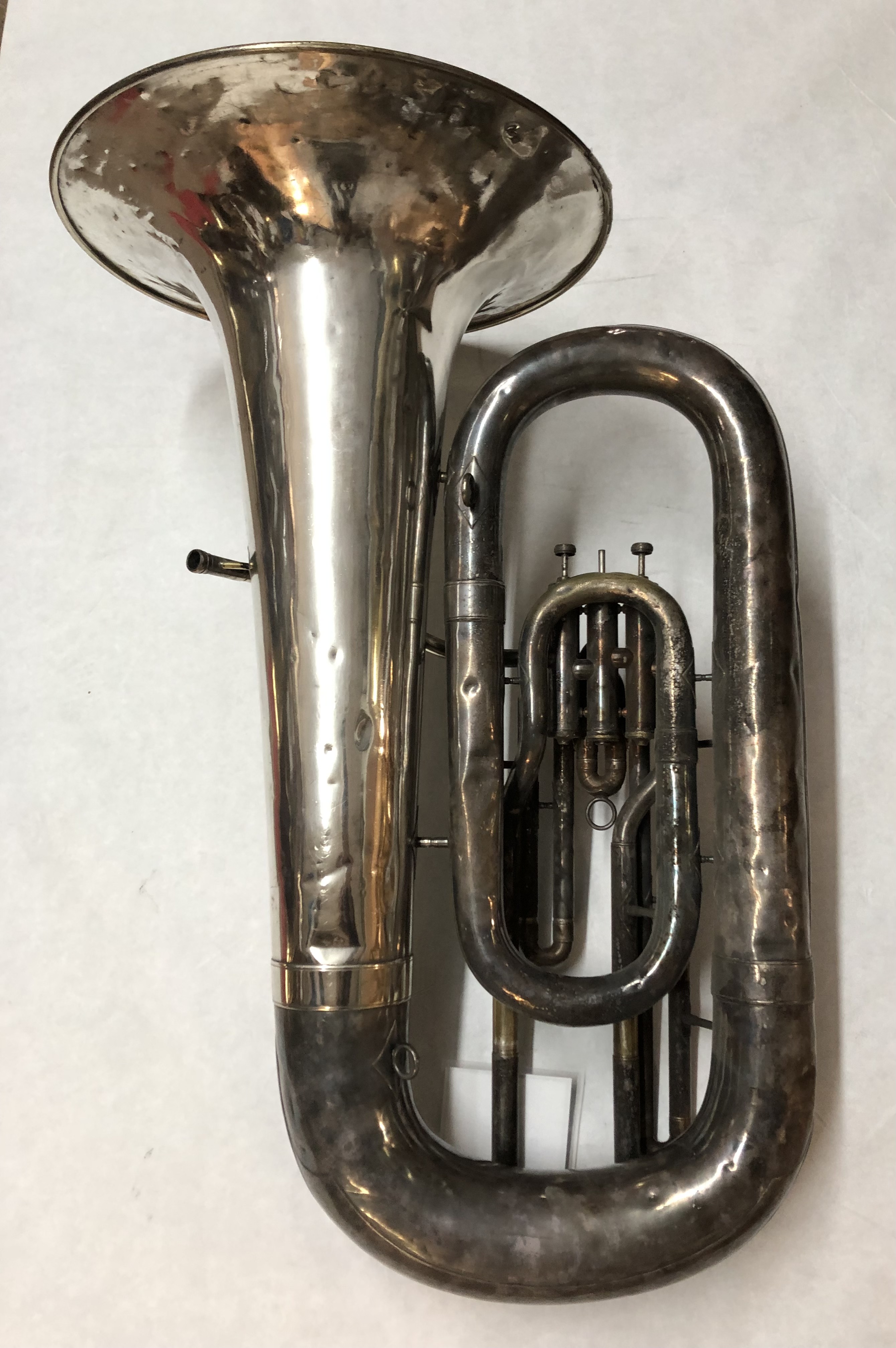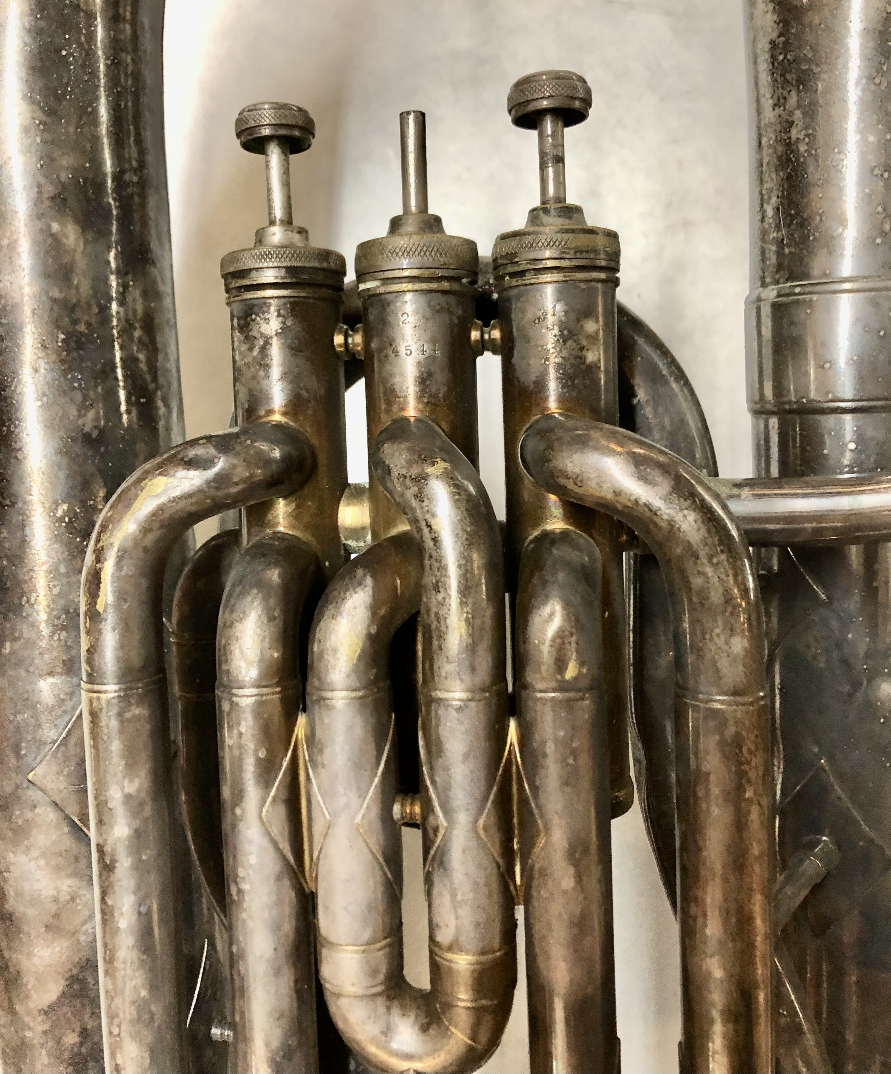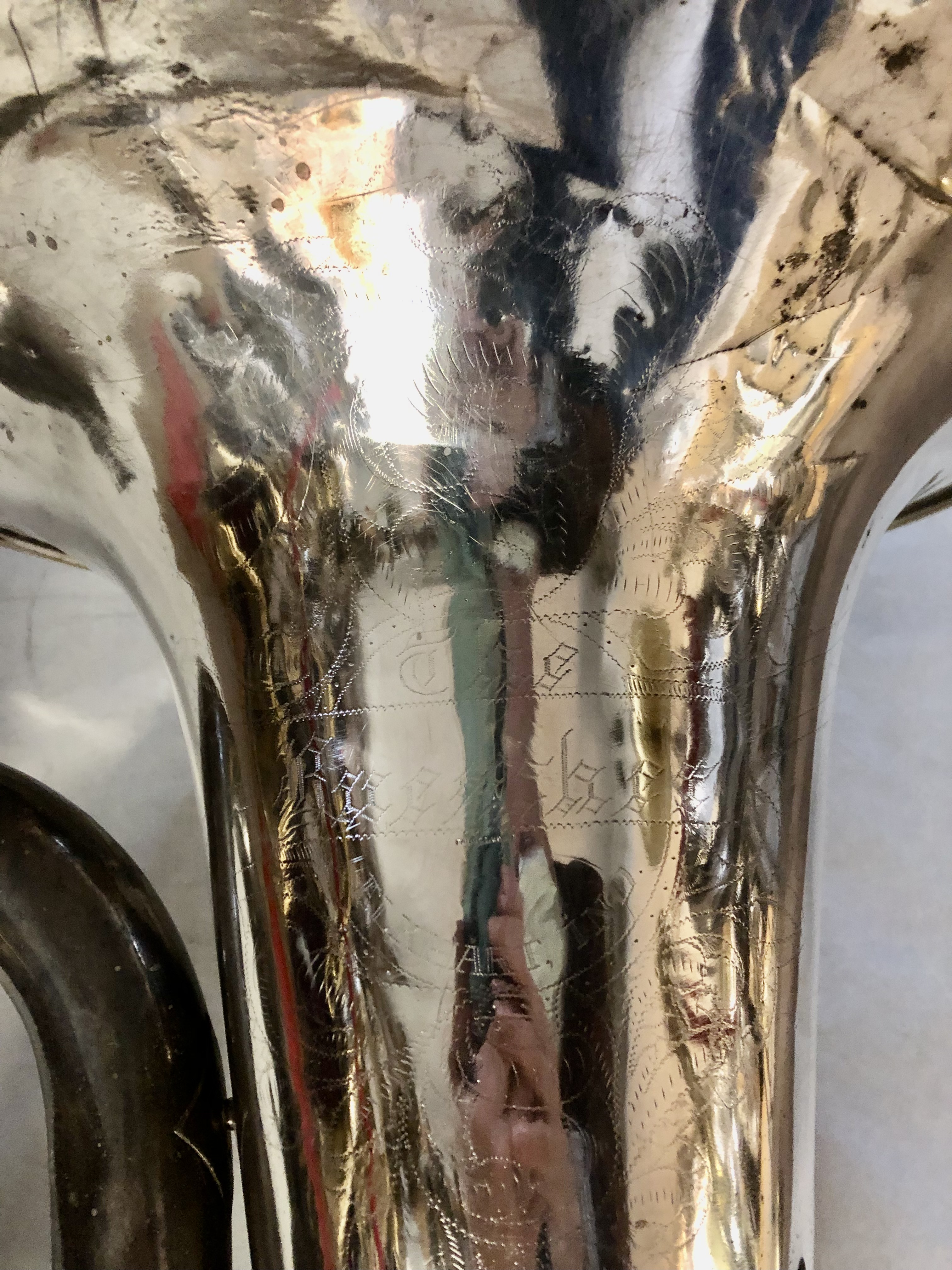 “THE / BUESCHER / ELKHART / IND / USA” on small end of bell. Floral engraving around identification marks.