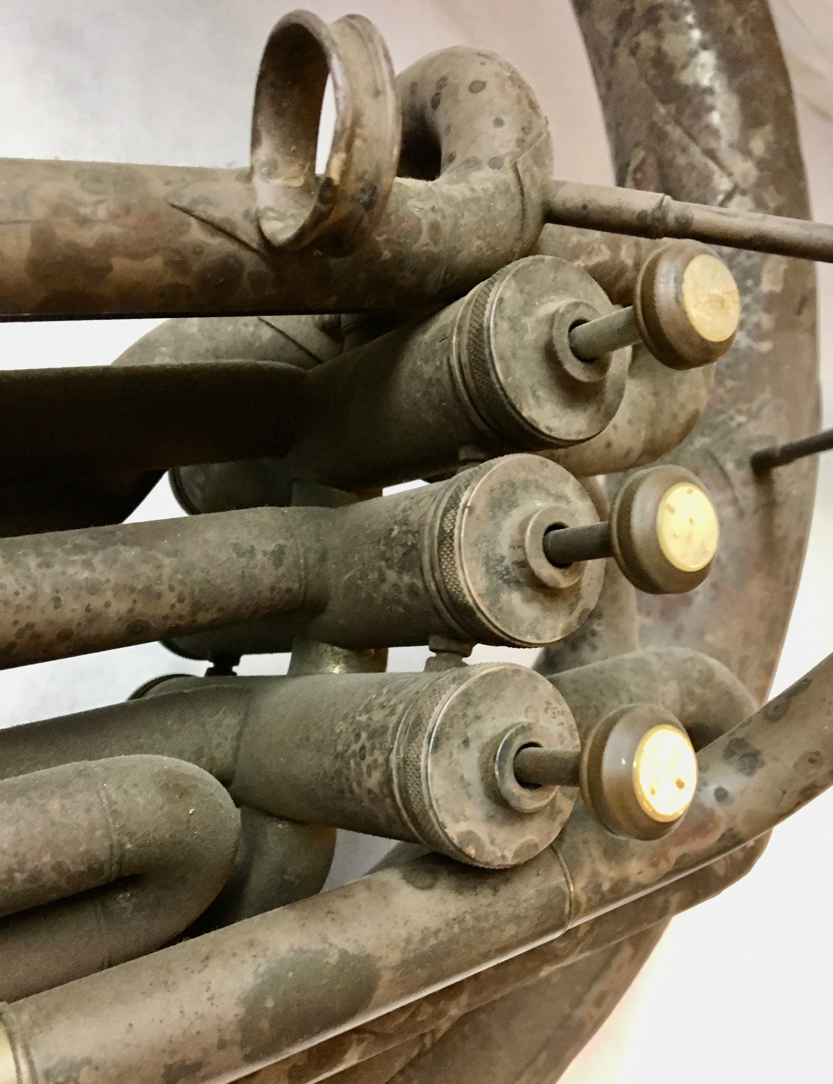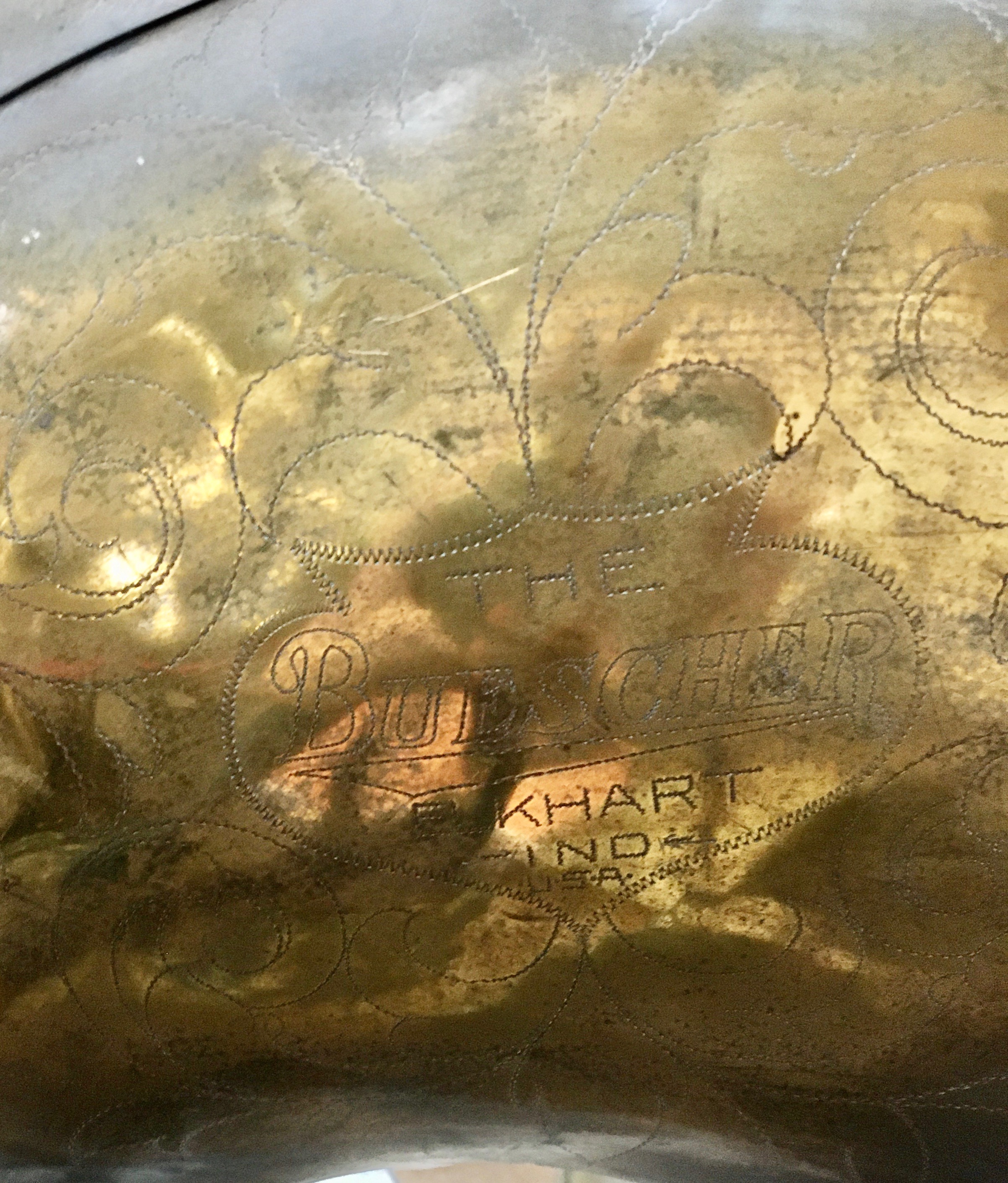 “THE / BUESCHER / ELKHART / IND / USA” on small end of bell. Floral engraving around identification marks.