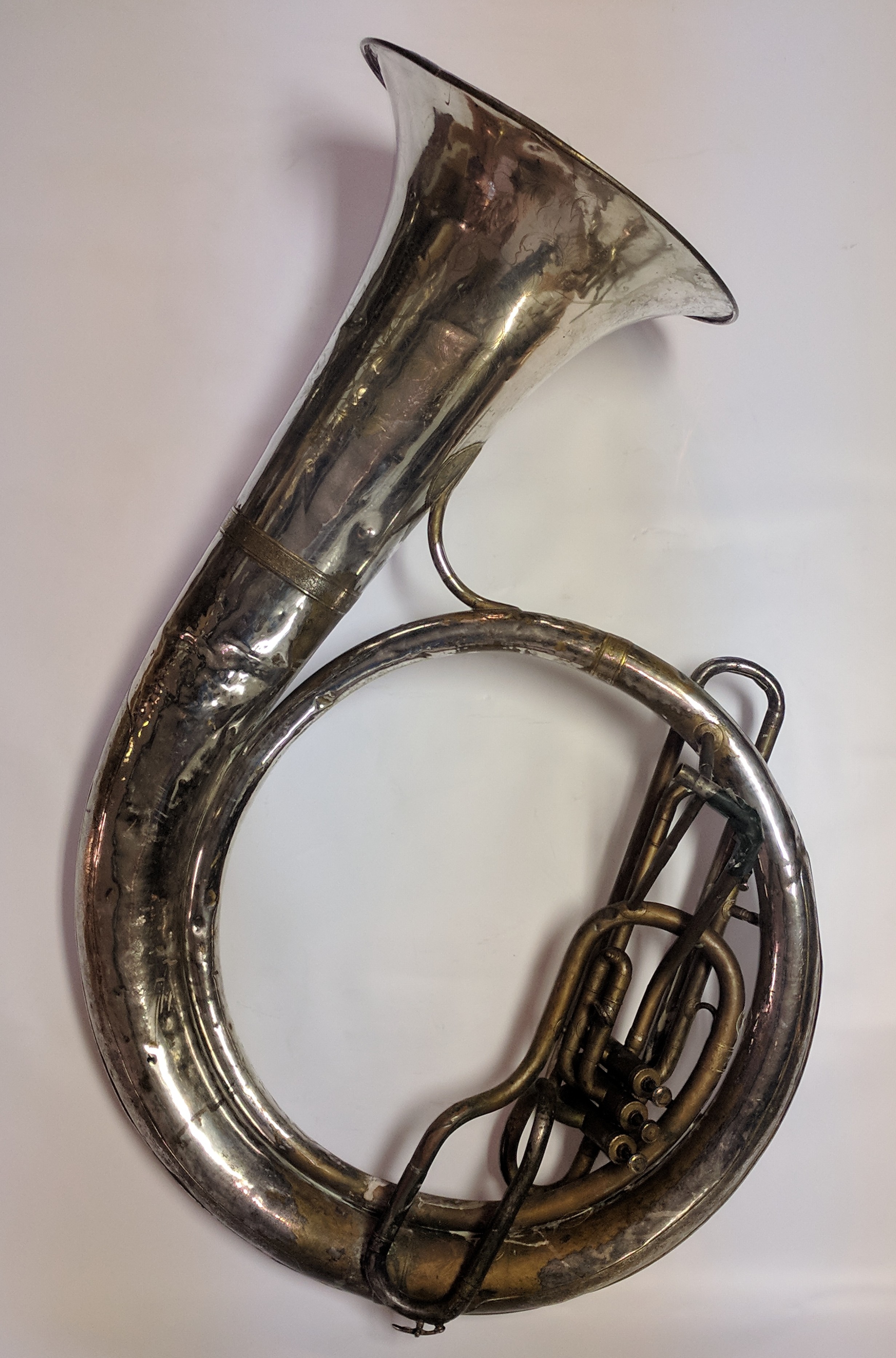 Comments: “SUPERIOR/HENRY DISTIN MFG. CO./MAKERS/WILLIAMSPORT. PA./HIGHEST GRADE/14080” on bell. Picture above shows the Washing Redskins band from 1937 with the helicon included.
