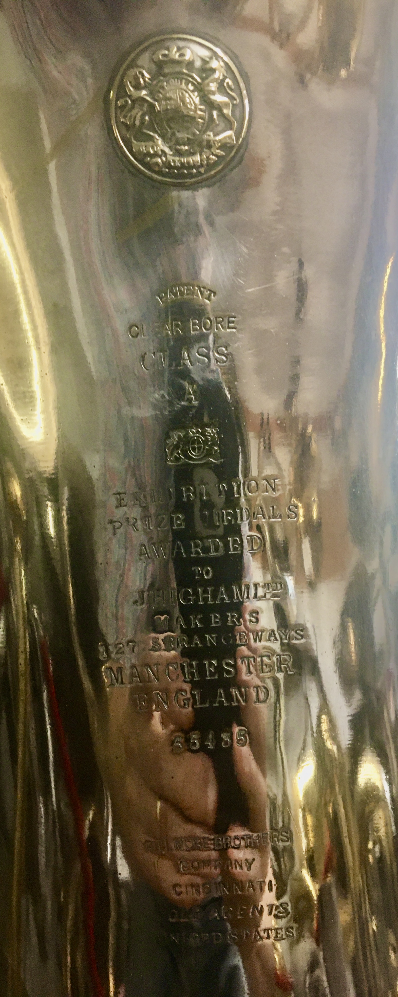 Coat of arms seal on bell. “PATENT / CLEAR BORE / CLASS / A / (small coat of arms) / EXHIBITION / PRIZE MEDALS / AWARDED / TO / J. Higham Ltd. / MAKERS / 127 STRANGEWAYS / MANCHESTER/ ENGLAND / 55435” on bell. “FILLMORE BROTHERS / COMPANY / CINCINNATI / SOLE AGENTS / UNITED STATES” added to bell later.