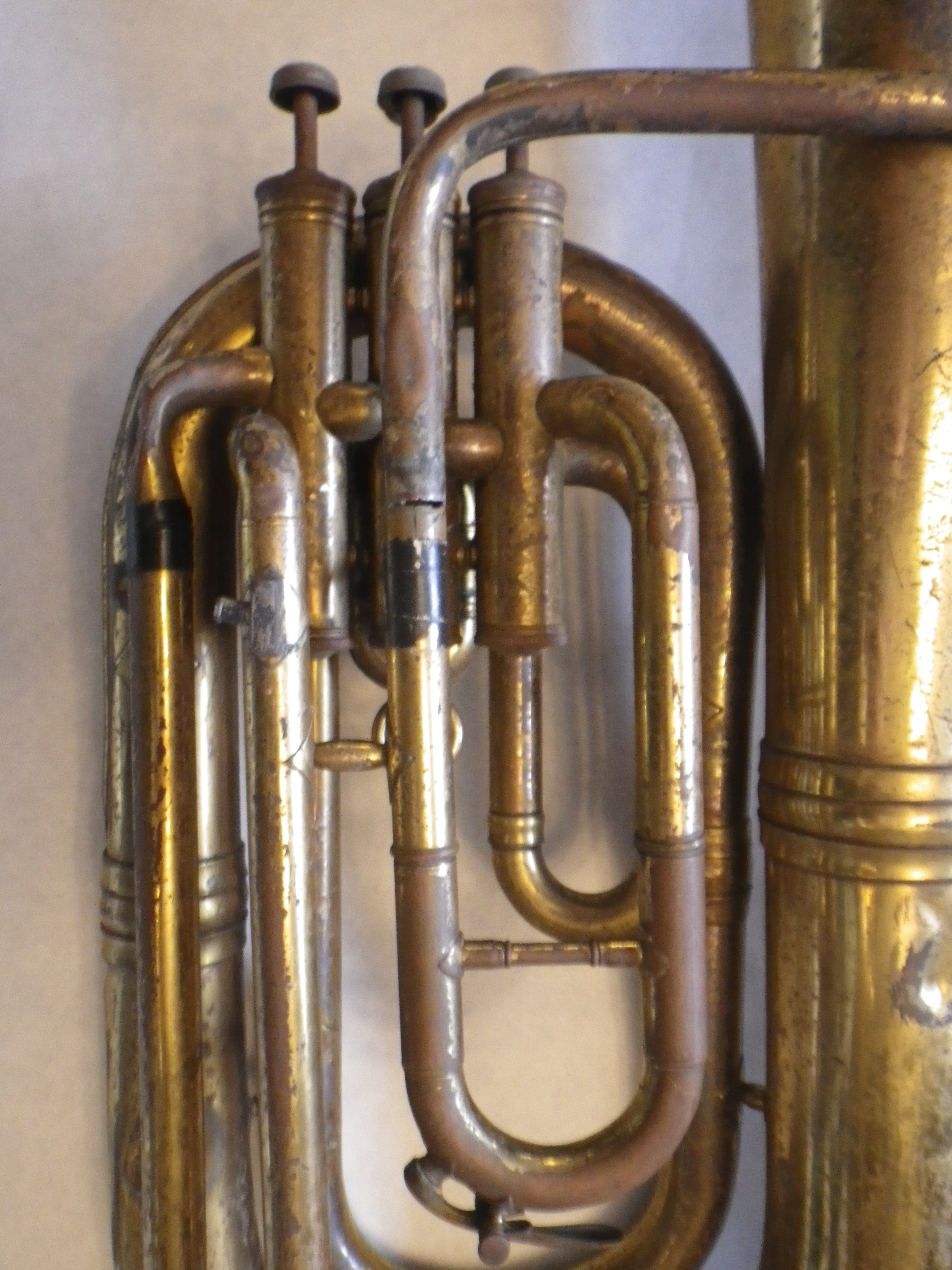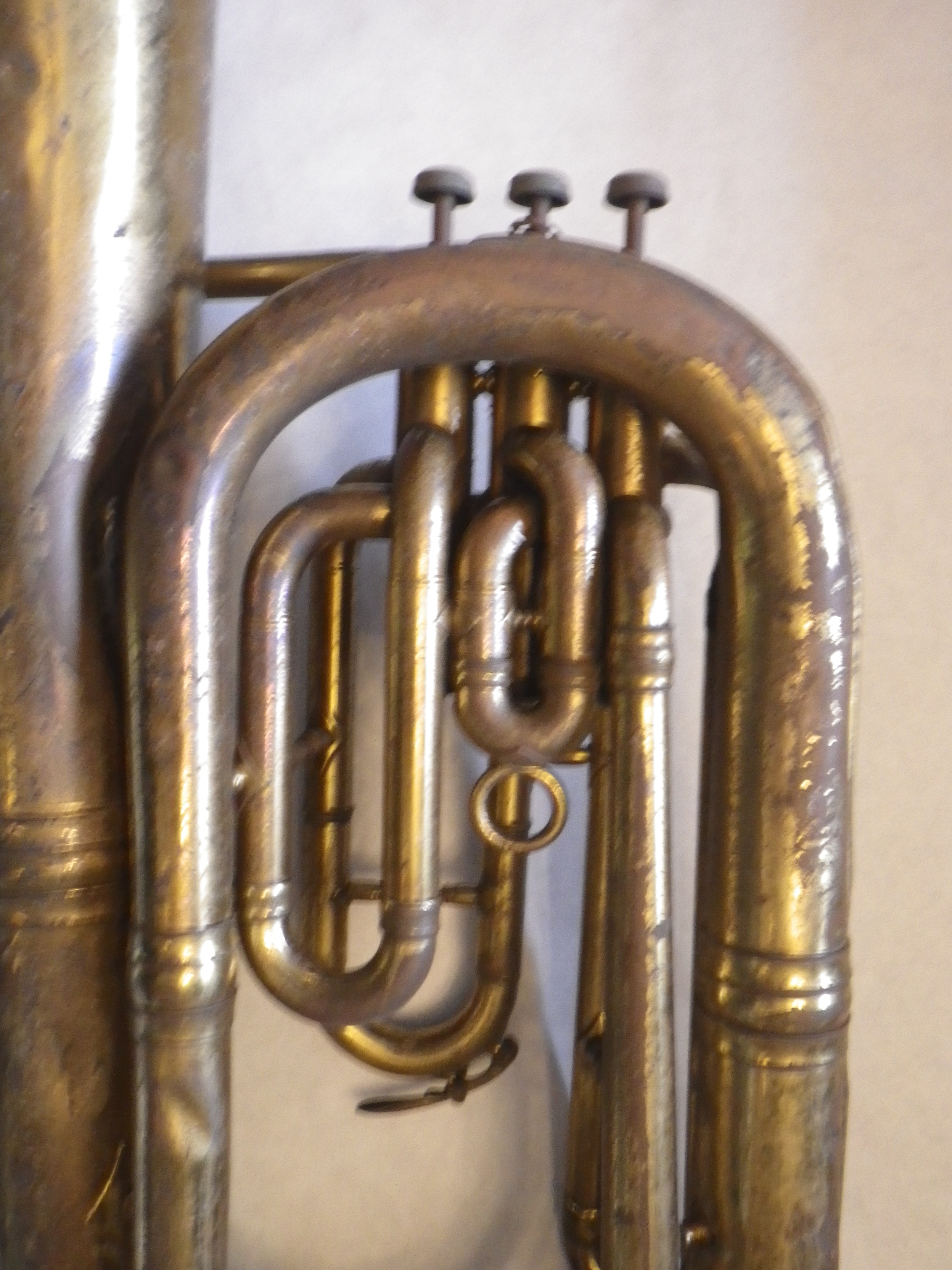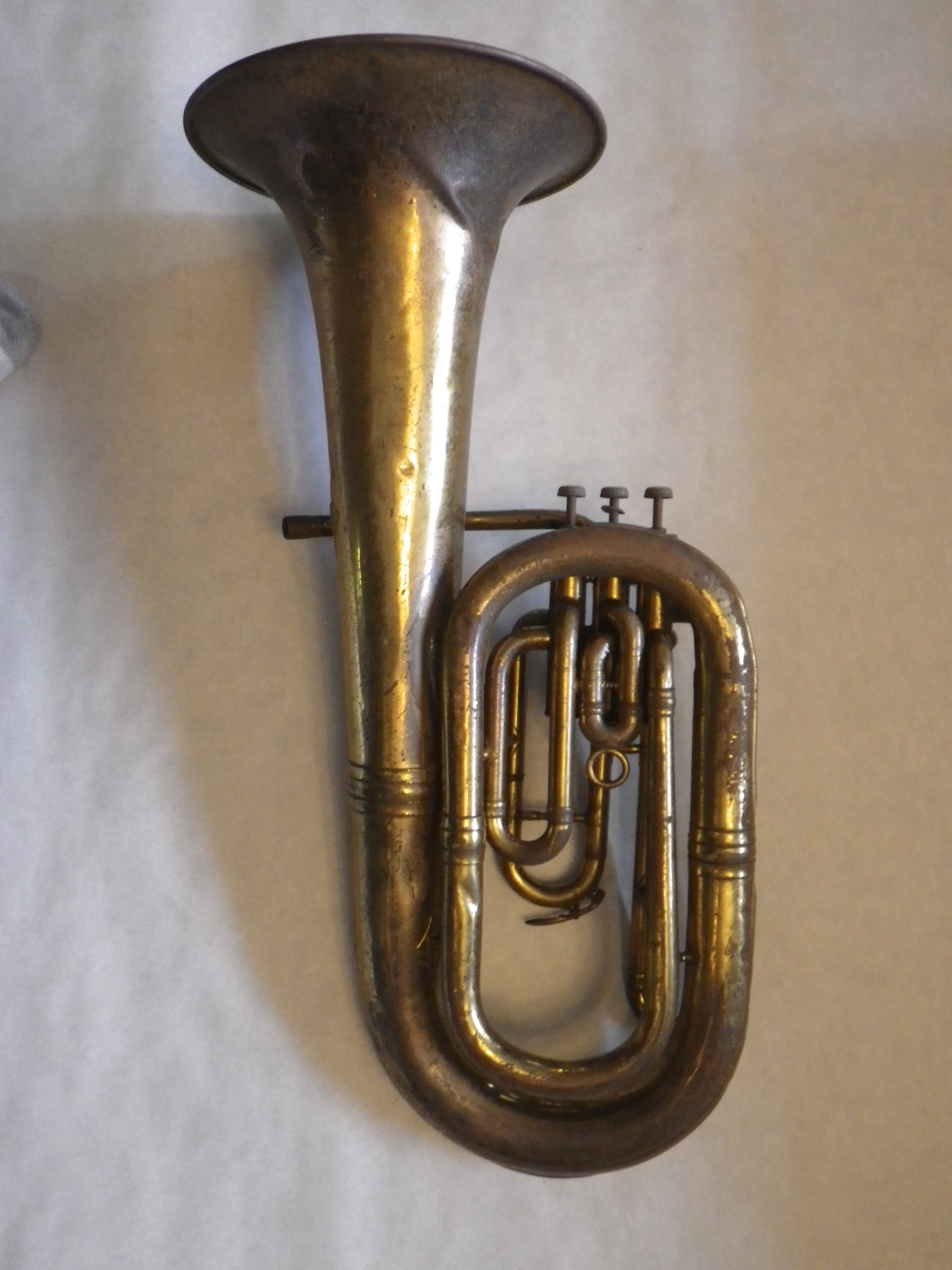 Keefer, B flat Baritone, 3 piston, c.1923 Tag #: 201402 Serial #: 11757 Bell Diameter Bore Size Height 10 3/8″ .560″ 26 1/4″ Comments: MADE BY / KEEFER / Williamsport, P.A. inside scroll on bell. Keefer in oval on third valve. 1 2 3 on valves. 11757 and LP on second valve. Nice knurled mouthpiece receiver, like the late Distin horns. Share this: Click to share on X (Opens in new window) X Click to share on Facebook (Opens in new window) Facebook Like Loading...