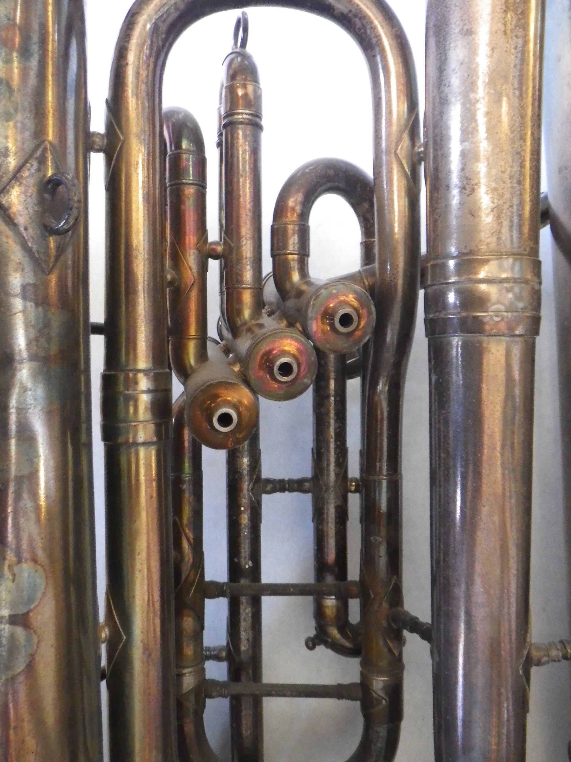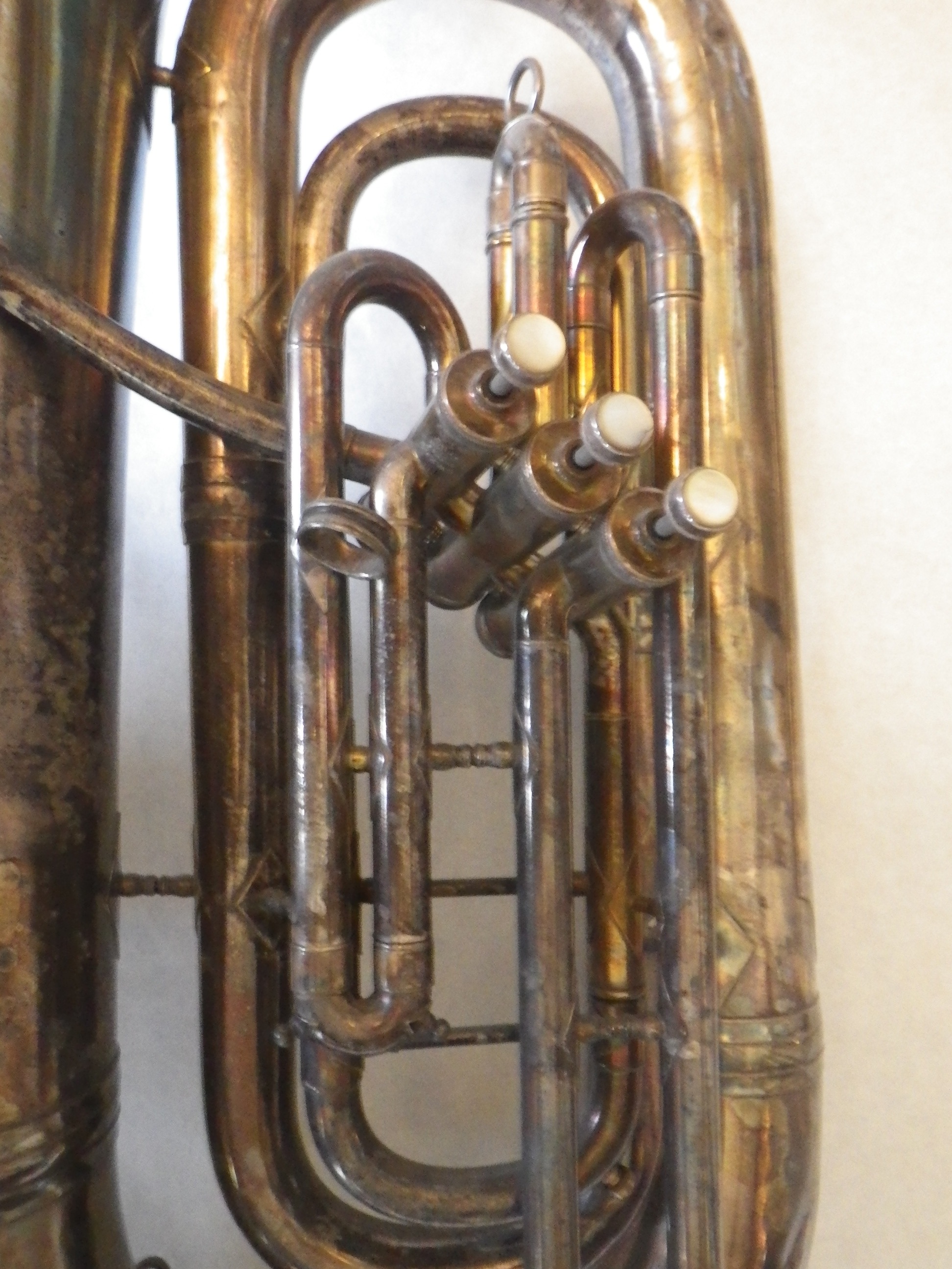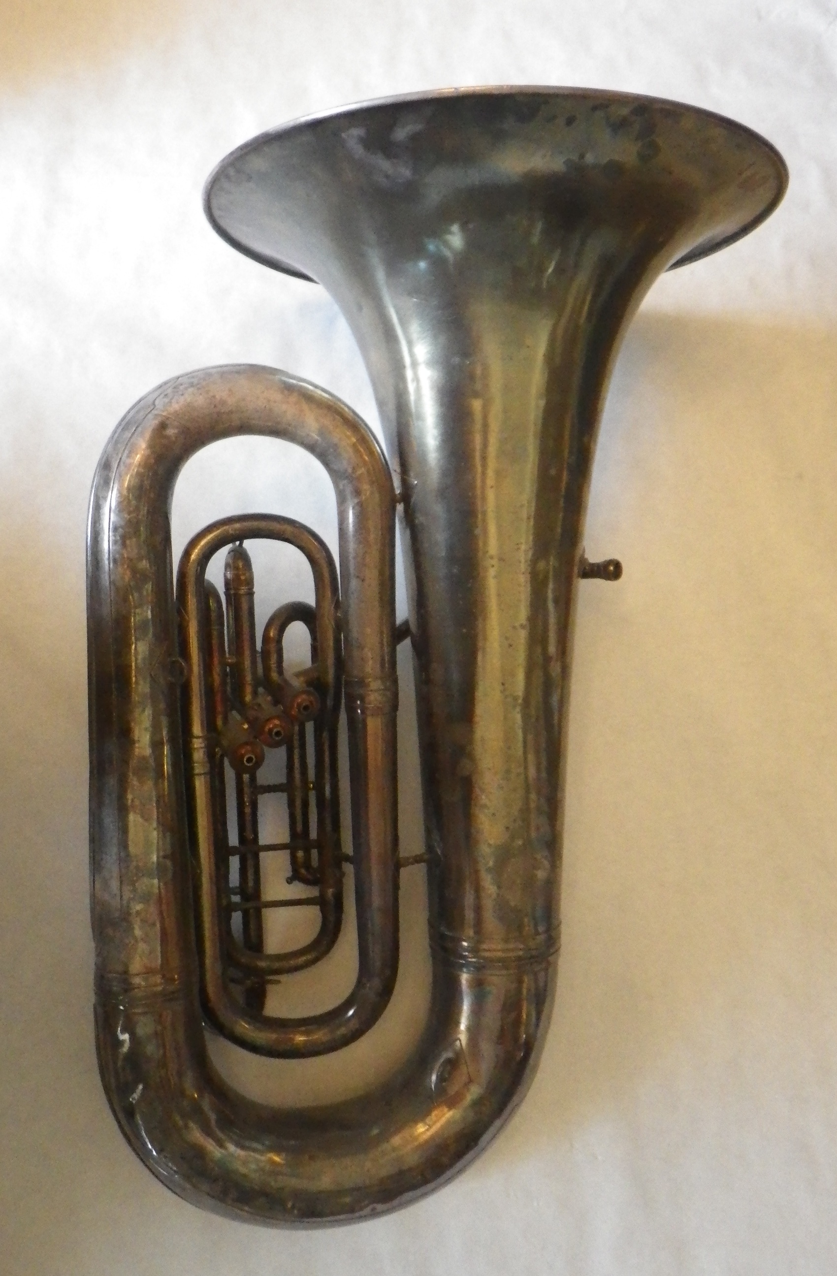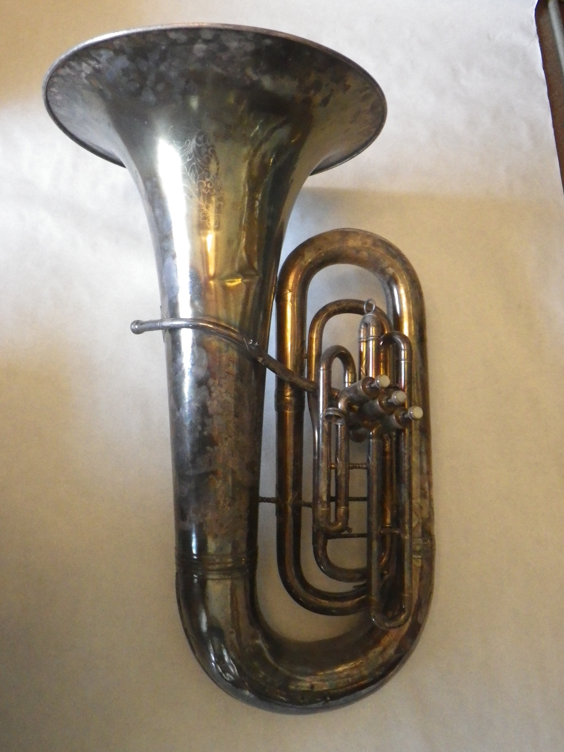 King, 1210, EE flat tuba, 3 piston, c.1934 Tag #: 03050 Serial #: 172475 Bell Diameter Bore Size Height 20.0″ .689″ 35.0″ Comments: “KING / MADE BY / THE H.N. WHITE CO. / CLEVELAND / O. ” on bell. Ornate floral engraving around identification marks. Share this: Click to share on X (Opens in new window) X Click to share on Facebook (Opens in new window) Facebook Like Loading...