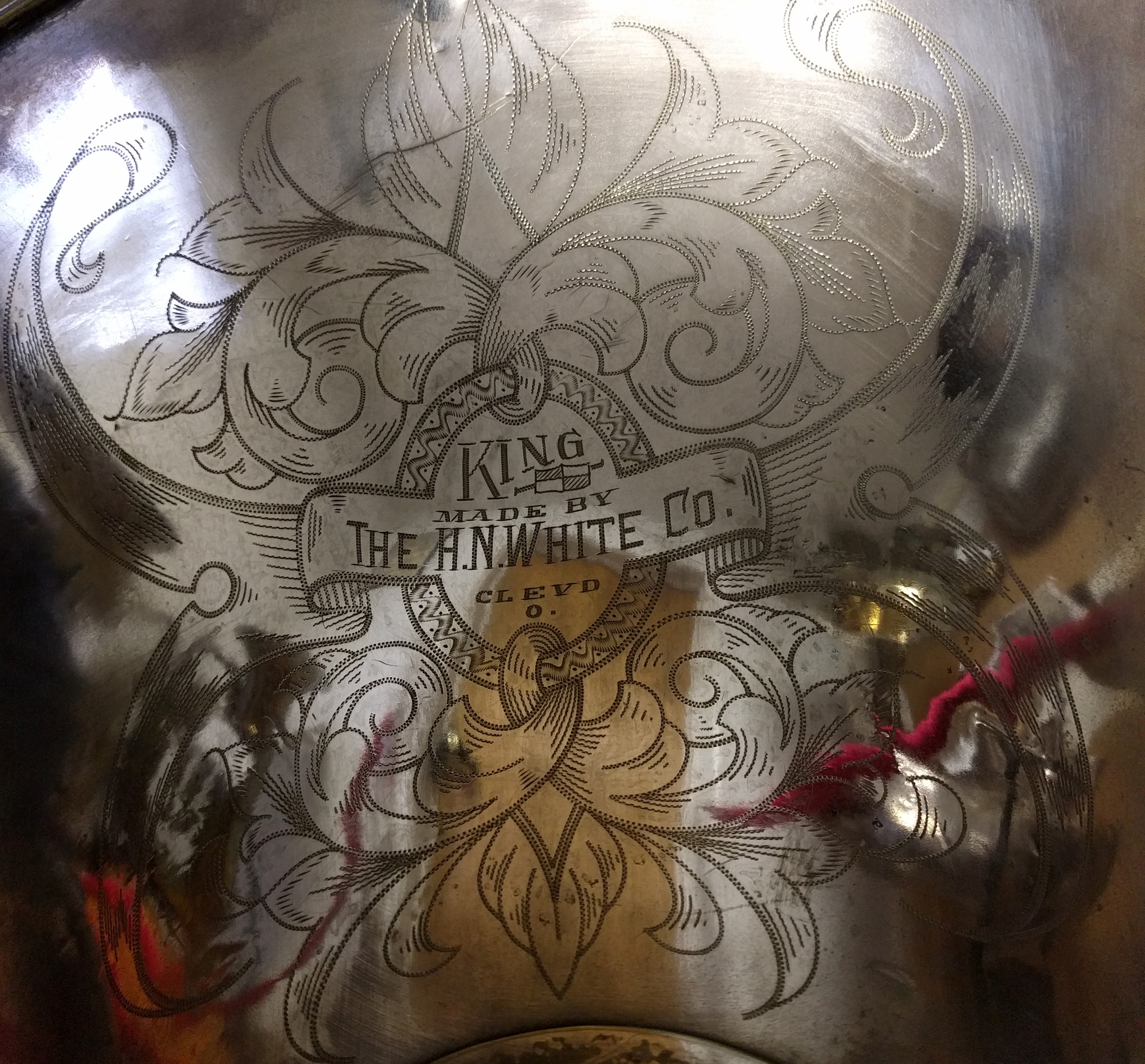 Comments: “KING/MADE BY/THE H.N. WHITE CO./CLEVD/O.” on bell. Unique engraving around text.