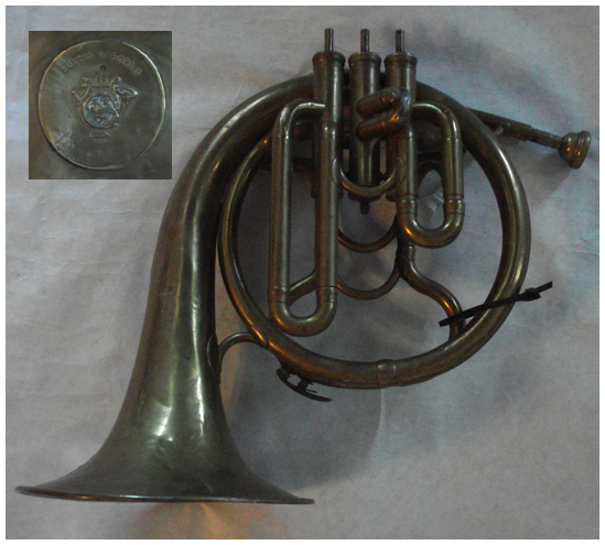 Engraved on bell: “[within banner:] LEGION D’HONNEUR / [within laurel:] JTL / QTE EXTRA / [within medals:] PARIS / OR / LONDRES / JEROME / THIBOUVILLE-LAMY & CO / MANUFACTURERS / Fr de l’Armée / BREVETÉ / s.g.[d].g. / 68 r. Réaumur / PARIS / NEW-YORK / C.O / 116315 / [on seal:] DULCIS & FORTIS / [design with lyre, bird, and horn] / JTL”. “16”, “J-T-L / QTÉ EXTRA / 17”, “18” on first, second, and third valves, respectively. Has been in TE collection since ca. 2007.