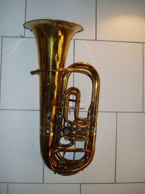 Unmarked, F tuba, 3 rotary Tag #: 02690 Serial #: Bell Diameter Bore Size Height 11 5/8″ .605″ 30.0″ Comments: Possibly a Czech instrument. Share this: Click to share on X (Opens in new window) X Click to share on Facebook (Opens in new window) Facebook Like Loading...