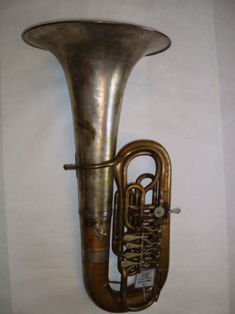Unmarked, York bell added, F tuba, 5 rotary Tag #: 200330 Serial #: Bell Diameter Bore Size Height 19 1/2″ .720″ 41″ Comments: “MADE BY / (J.W.) York & Sons / Grand Rapids / Mich.” on bell. Floral engraving around identification marks. Share this: Share on X (Opens in new window) X Share on Facebook (Opens in new window) Facebook Like Loading...