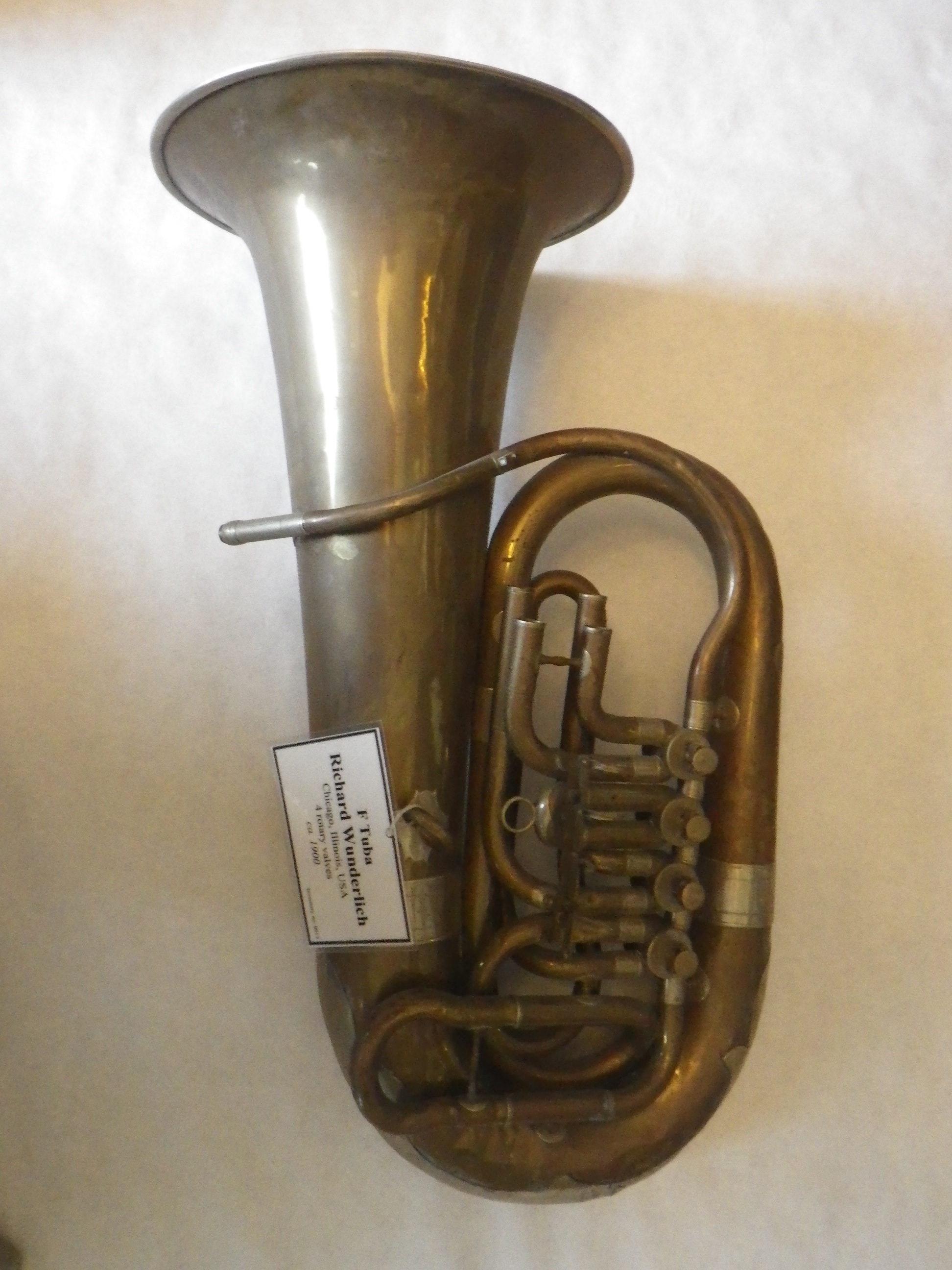 Wunderlich, F tuba, 4 rotary, ca.1891-1916 Tag #: 00013 Serial #: Bell Diameter Bore Size Height 14 1/2″ .772″ 31 1/4″ Comments: “R. WUNDERLICH / MAKER / CHICAGO” on bell. Some floral engraving around identification marks. Share this: Click to share on X (Opens in new window) X Click to share on Facebook (Opens in new window) Facebook Like Loading...