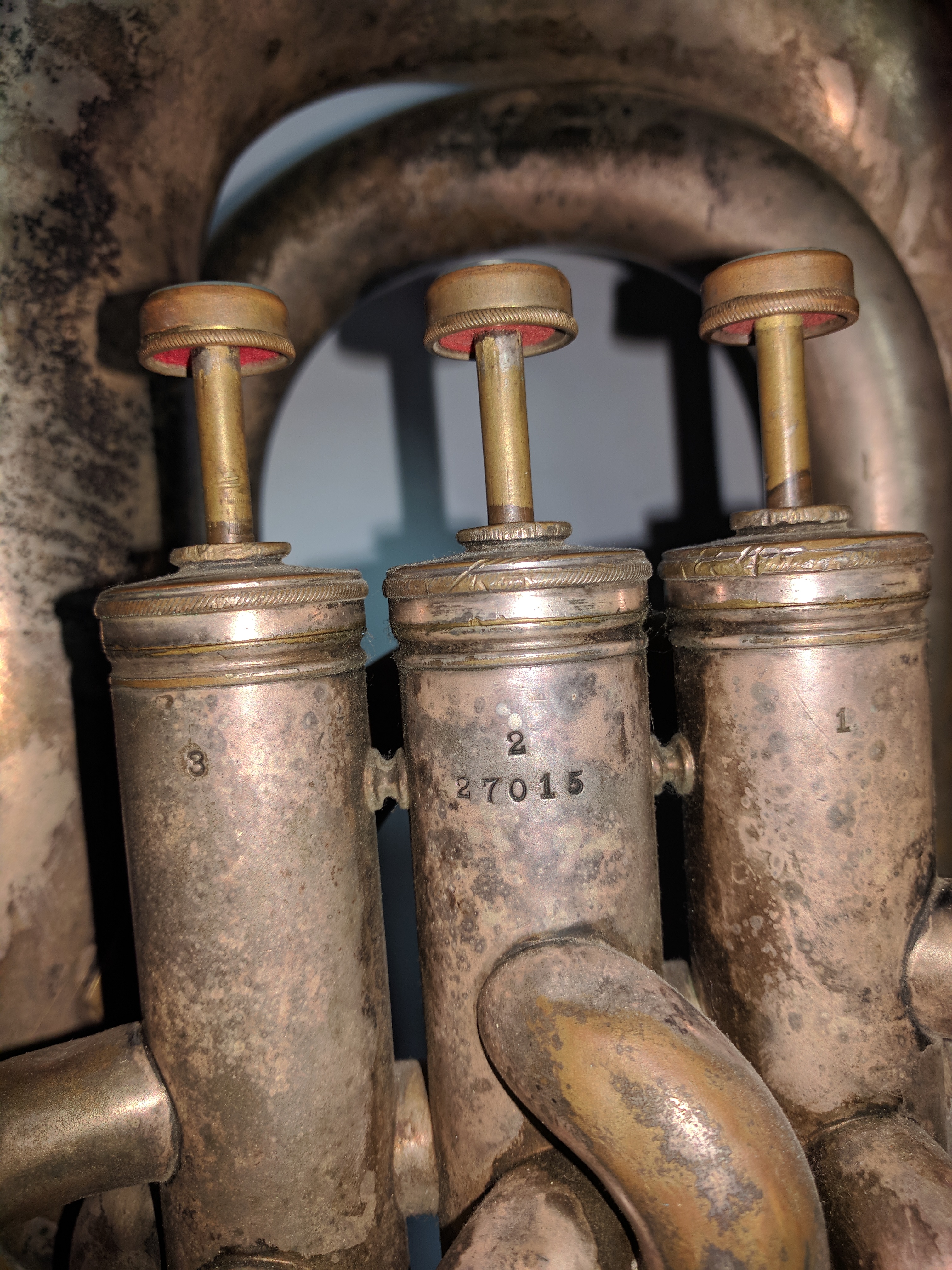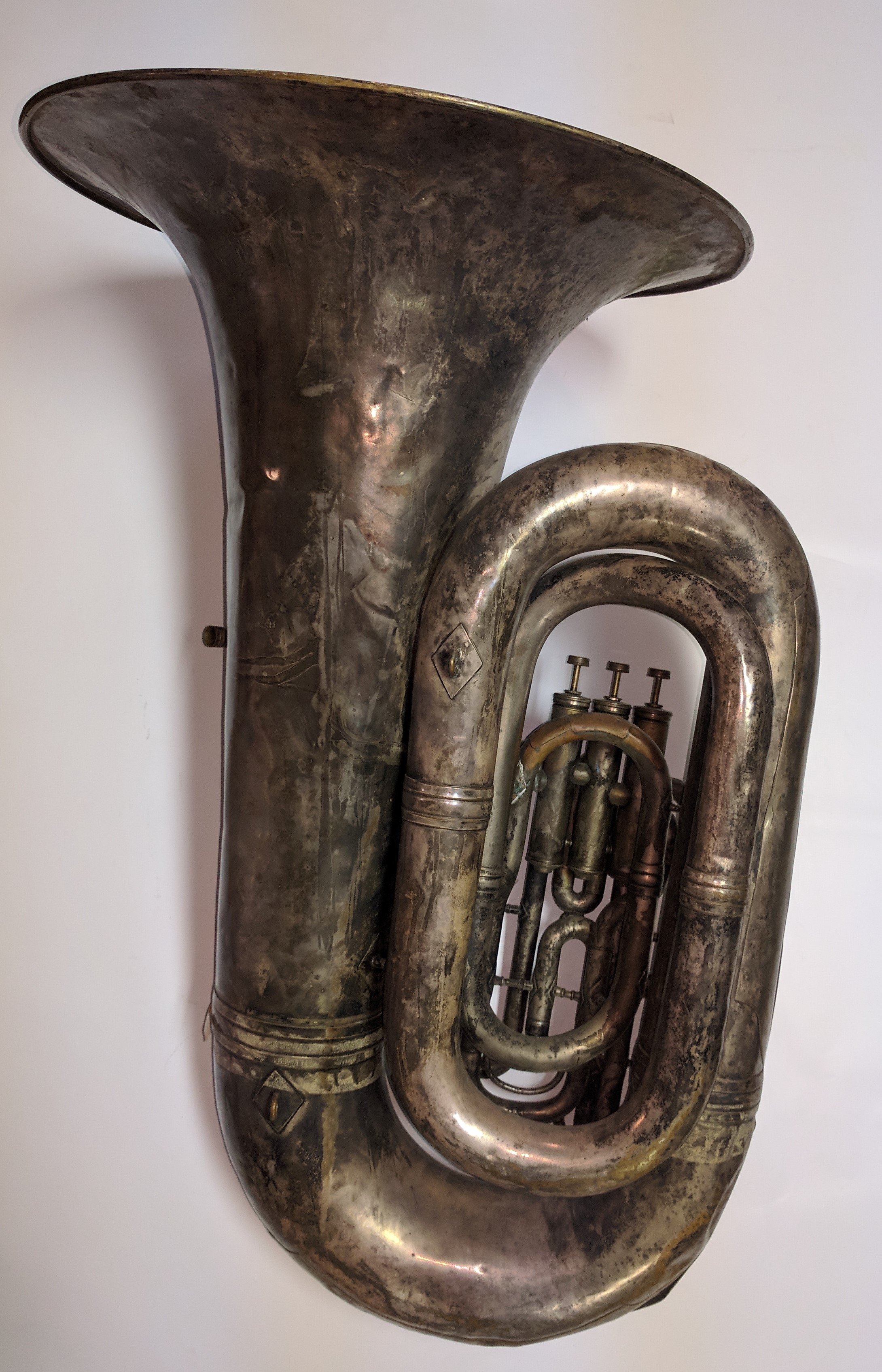 York, BB flat tuba, 3 piston, c.1911 Tag #: 02841 Serial #: 27015 Bell Diameter Bore Size Height 22 1/2″ .750″ 36 3/4″ Comments: “Made By / J.W. York & Sons / Grand Rapids Mich.” on bell. Some floral engraving around identification marks. “Patented / July 12 1910” on placque on tubing. Share this: Click to share on X (Opens in new window) X Click to share on Facebook (Opens in new window) Facebook Like Loading...
