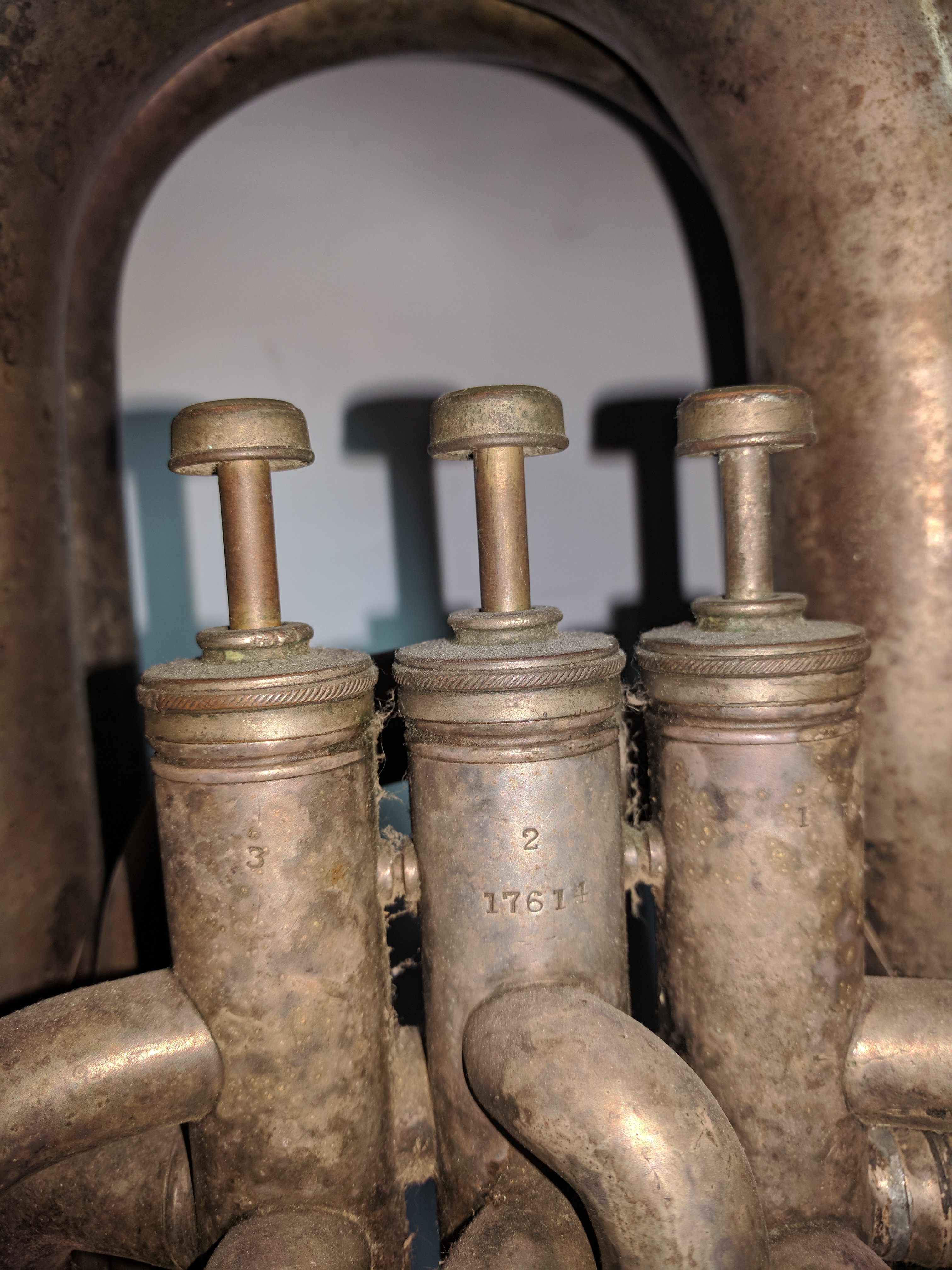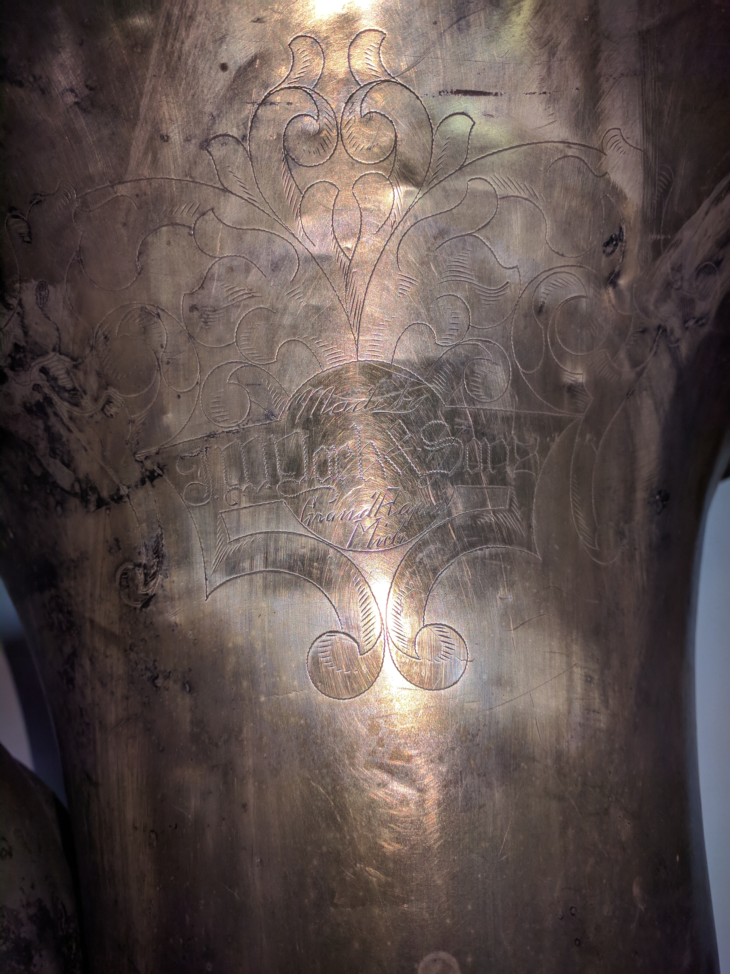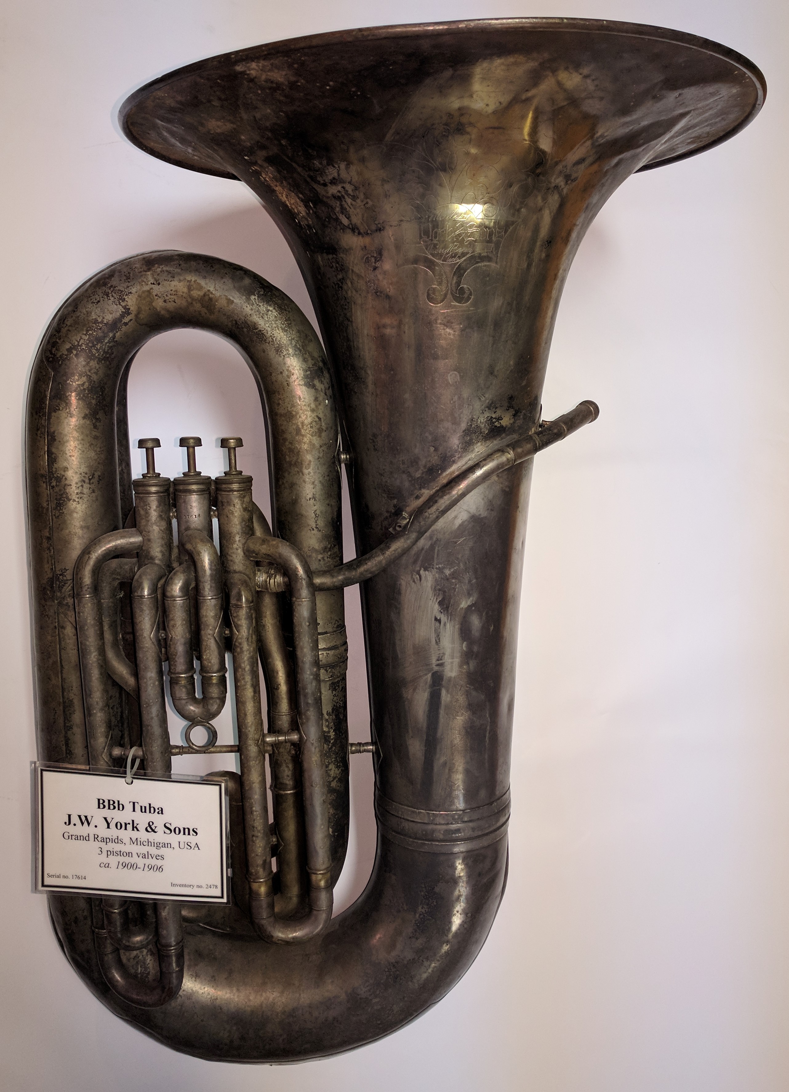 York, BB flat tuba, 3 pistons, c.1907 Tag #: 02478 Serial #: 17614 Bell Diameter Bore Size Height 19 5/8″ .654″ 32.0″ Comments: “Made by / J.W. York & Sons / Grand Rapids / Mich.” Some floral engraving around identification marks. Share this: Click to share on X (Opens in new window) X Click to share on Facebook (Opens in new window) Facebook Like Loading...