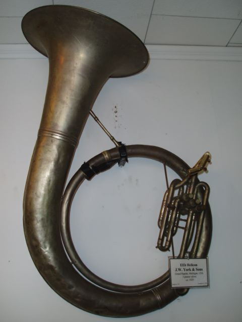 York, EE flat helicon, 3 piston, c.1920 Tag #: 02791 Serial #: 57737 Bell Diameter Bore Size 19 1/2″ .654″ Comments: “J.W. YORK & SONS / GRAND RAPIDS / MICH.” on bell. Floral engraving around identification marks. Share this: Click to share on X (Opens in new window) X Click to share on Facebook (Opens in new window) Facebook Like Loading...