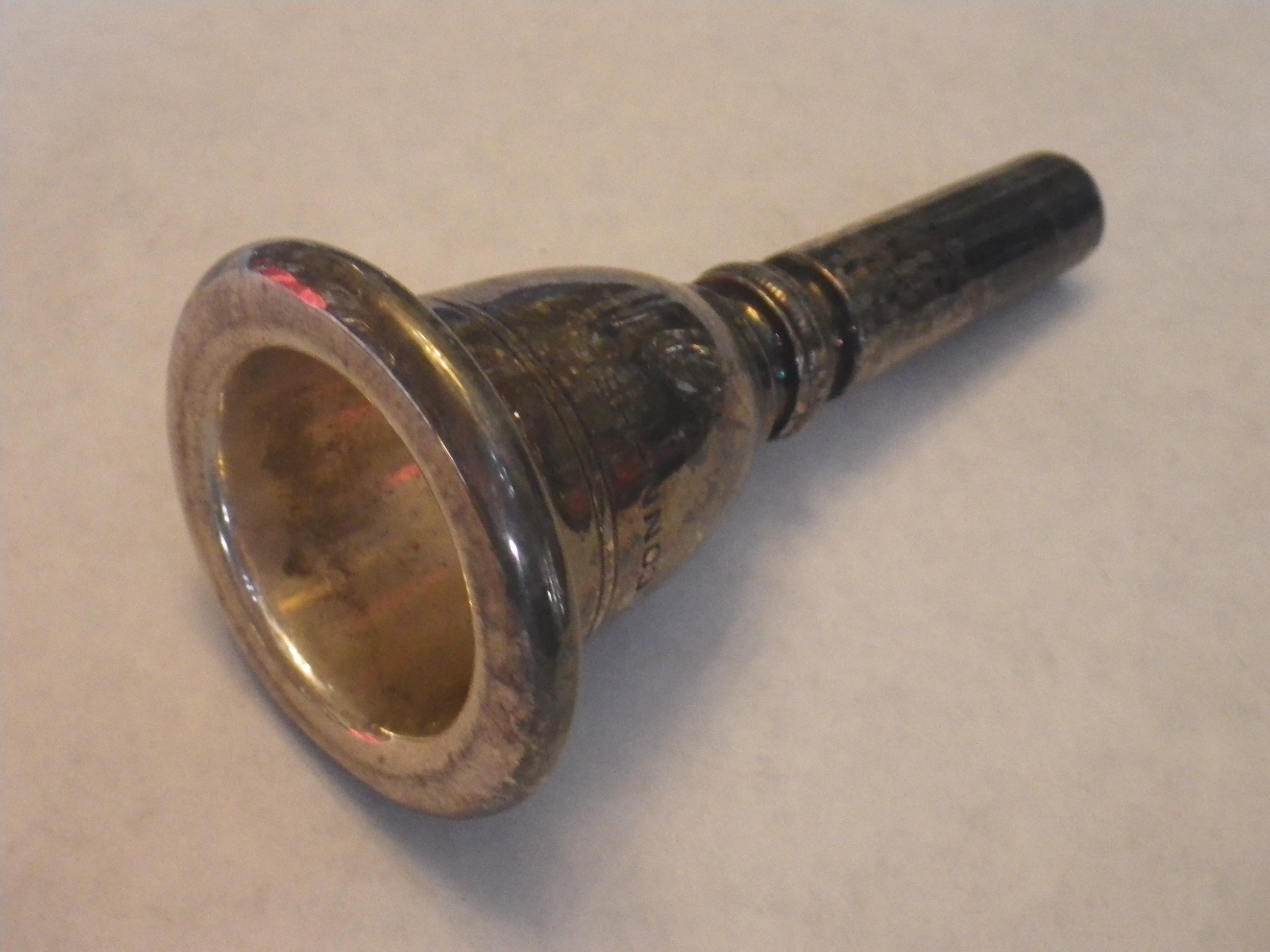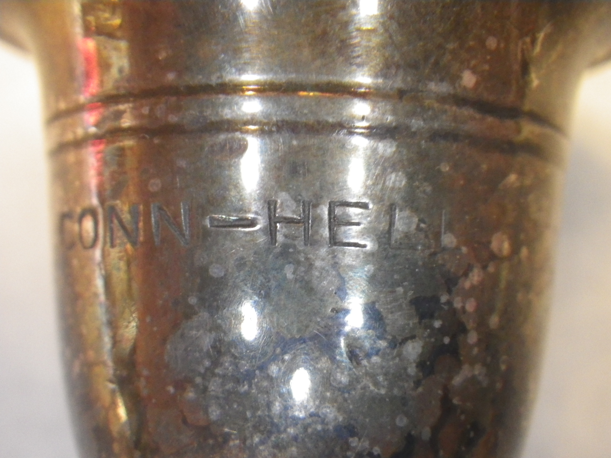 “CONN – HELLEBERG″ text on side, somewhat rubbed out. This later type of Helleberg tuba mouthpiece was marked with the full “Conn – Helleberg” on the cup. Contrast this with the first style Helleberg, which only had an “H” on the cup.