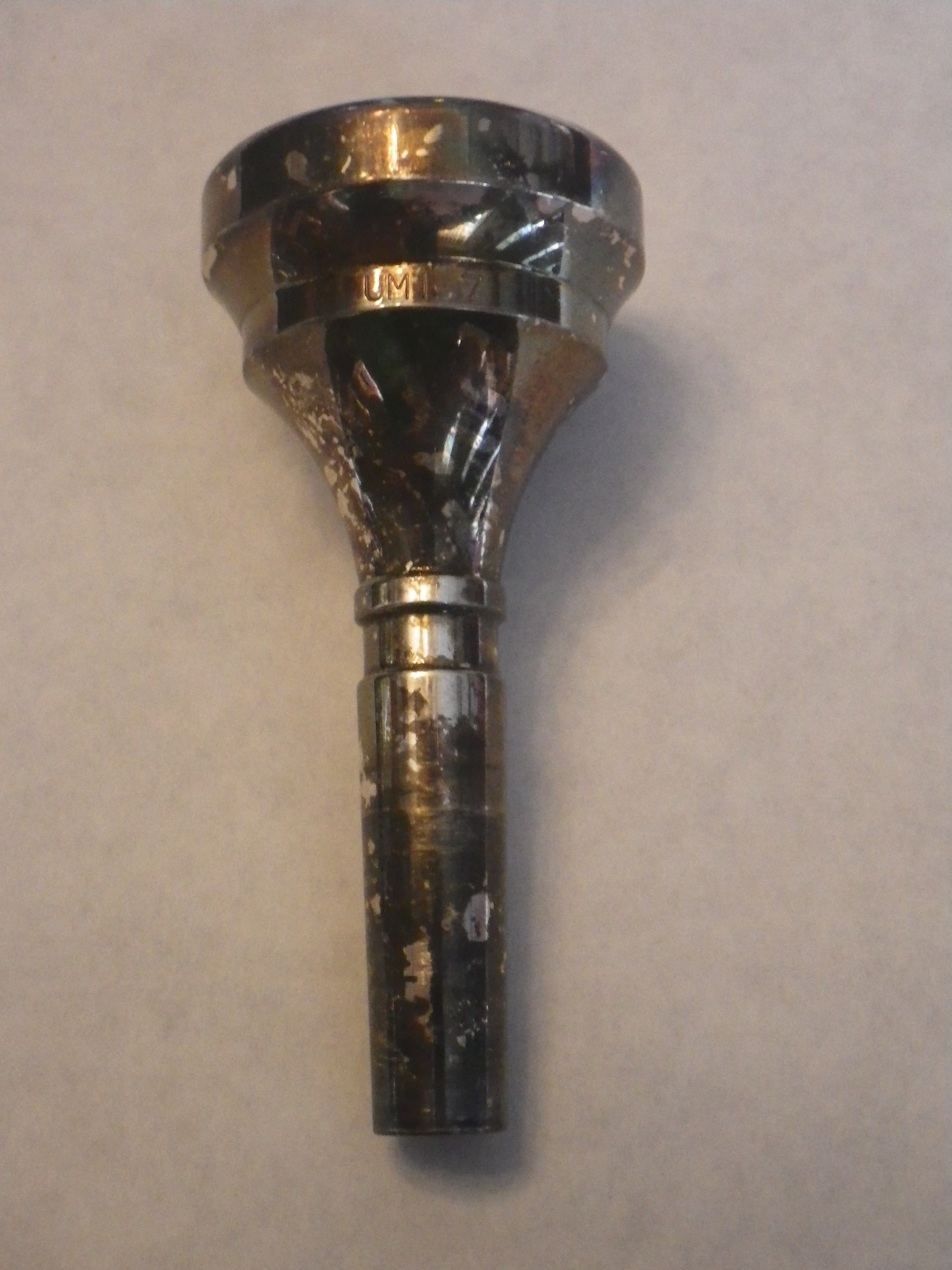 UMI 7 Tuba Mouthpiece Tag #: M201405 Length Inner Rim Diameter Throat Diameter Cup Depth Shank End Diameter 3.900″ 1.335″ .331″ 1.27″ .522″ Comments: “UMI 7” text on side. Share this: Click to share on X (Opens in new window) X Click to share on Facebook (Opens in new window) Facebook Like Loading...